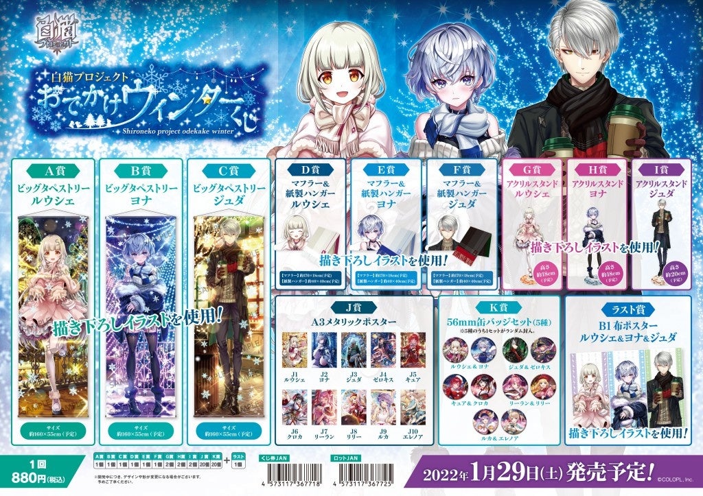 全国の書店、キャラクターグッズ専門店にて、『白猫』の人気キャラクター、ルウシェ、ヨナ、ジュダの描き下ろしイラストを使用した、マフラー&紙製ハンガーやアクリルスタンドなどの豪華ラインナップのくじが2022年1月29日(土)より販売いたします。