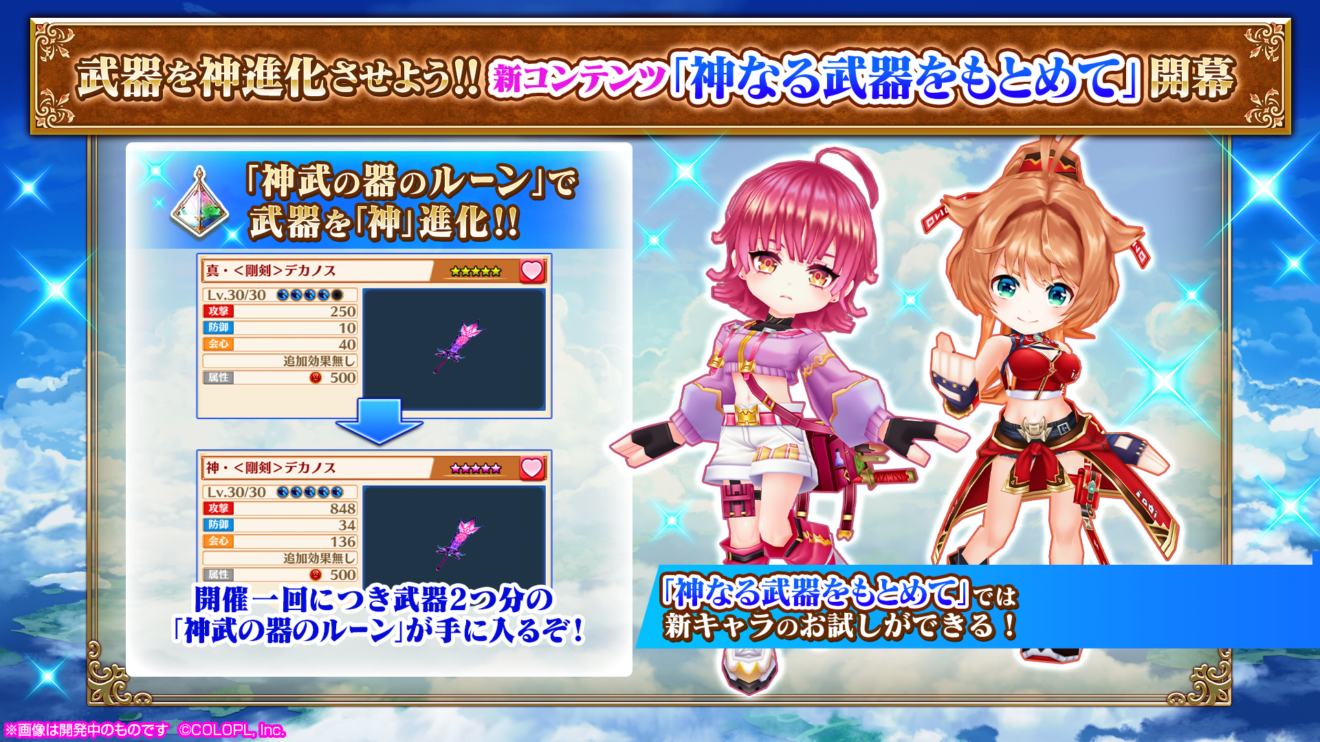 さらに武器の精霊たちが活躍するイベントということで、武器「ルグノス(斧)」と「ニードレイ」、また今後登場する武器をさらに強くできる『「神」進化』を実装いたしました。後日開催する特別なクエストを攻略することで、進化用のゲーム内アイテムを入手することができます。本クエストでは、キャラガチャに登場しているコルネとリリアをお試しで遊ぶことができ、難易度もやりがいのあるものとなっております。ぜひ、イベントと合わせてお楽しみください。