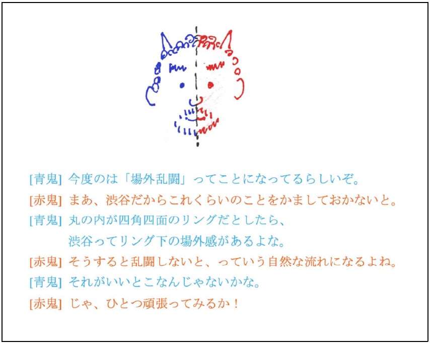 日本を代表する建築家であり、渋谷駅周辺の再開発において、2006年から建築デザインや景観を調整する「デザイン会議」の座長などを務める内藤廣氏が手がける全45のプロジェクトを、内藤氏自身の頭の中に宿る「赤鬼」と「青鬼」が、リング下の場外乱闘さながらに解説する、異色の展覧会です。