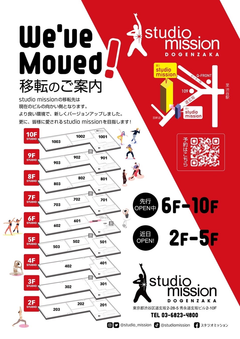 この度、入居している新大宗ビル4号館が「渋谷区道玄坂二丁目南地区第一種市街地再開発事業の施行」の開発地域である為、現スタジオの道路を挟んで真向かい側のビル(元カラnet)に移転することとなり、『studio mission DOGENZAKA』として10/1より移転・リニューアルオープンいたしました。