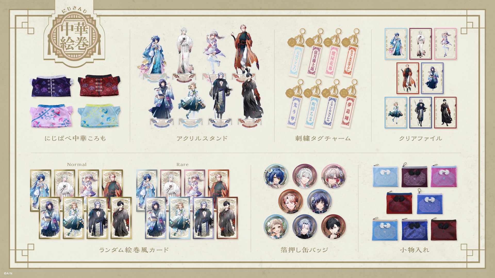 グッズラインナップは、ランダム絵巻風カード、箔押し缶バッジ、アクリルスタンド、クリアファイル、刺繍タグチャーム、小物入れの6種類。さらに、「にじぱぺっとカスタマイズシリーズ」から、にじぱぺっと用の中華ころもが登場!