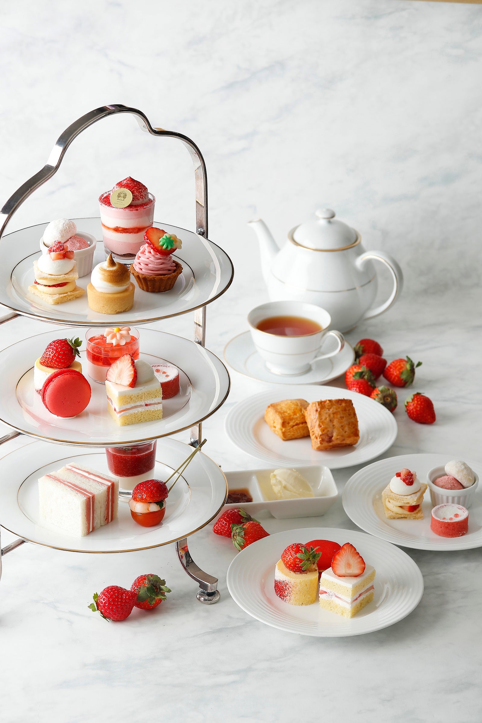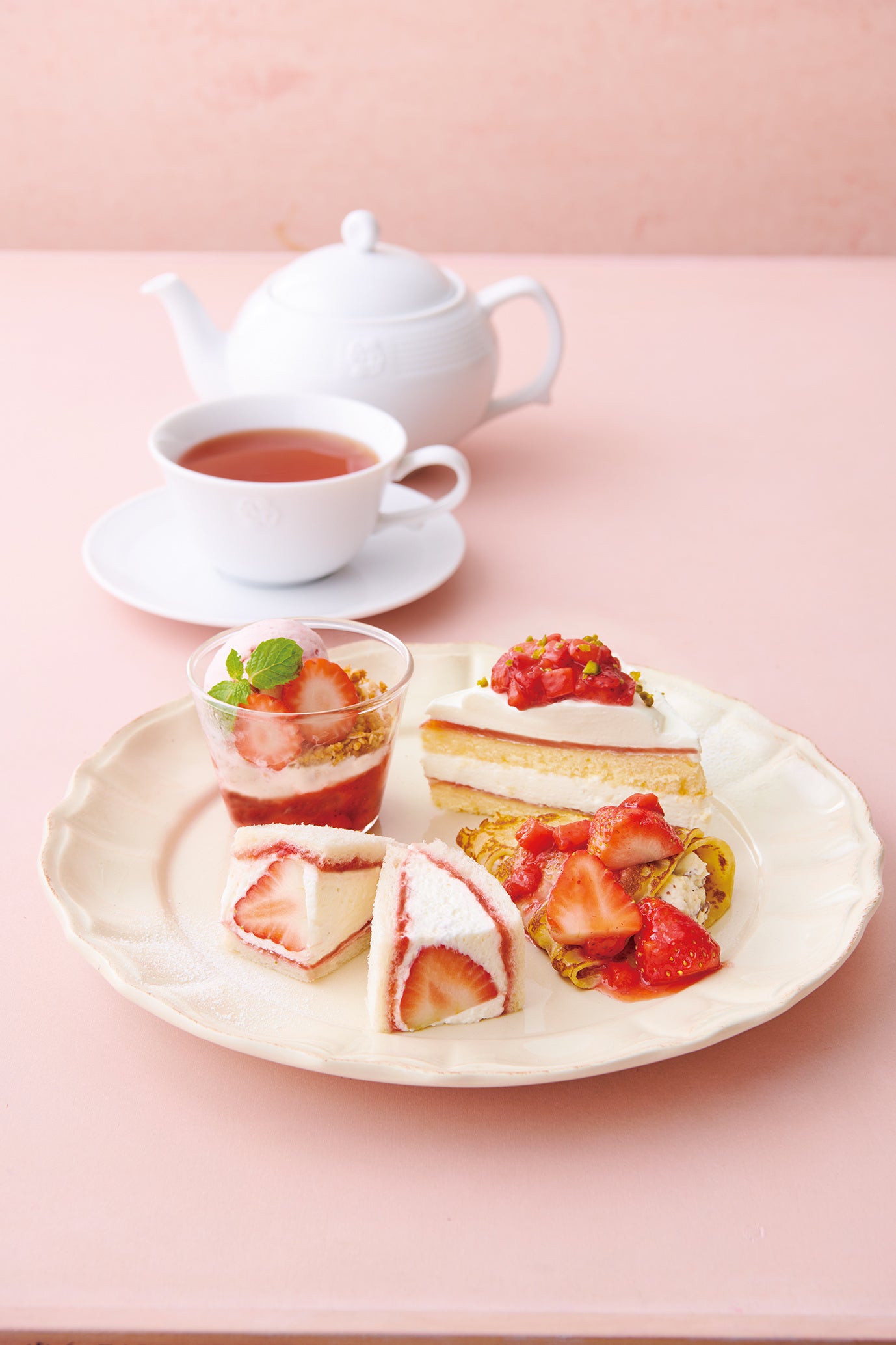 季節限定のイチゴのスイーツ3品+選べるスイーツ1品とお好みのお茶が楽しめる、