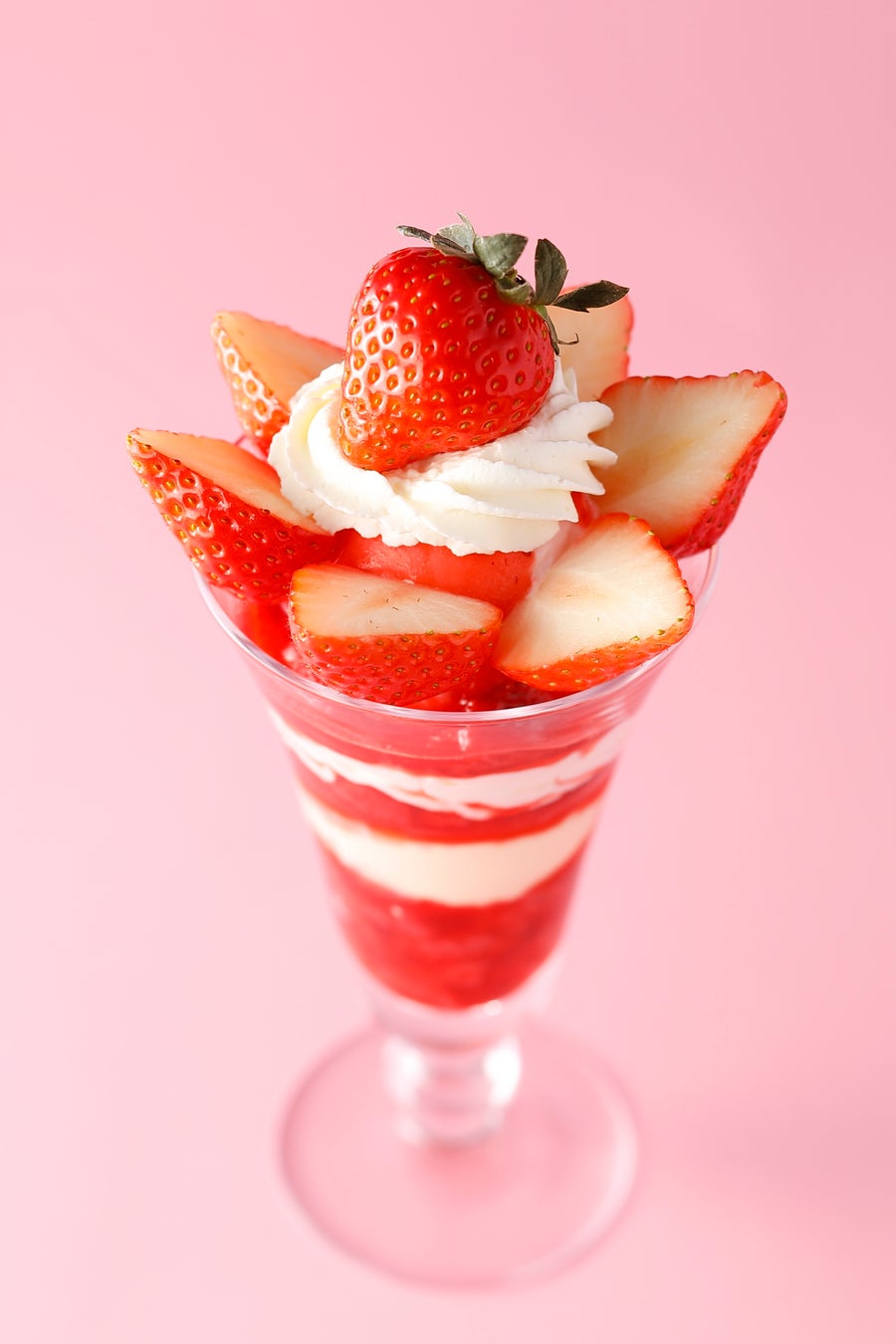 イチゴマスカルポーネムース、イチゴソース、イチゴアイスを重ねました。