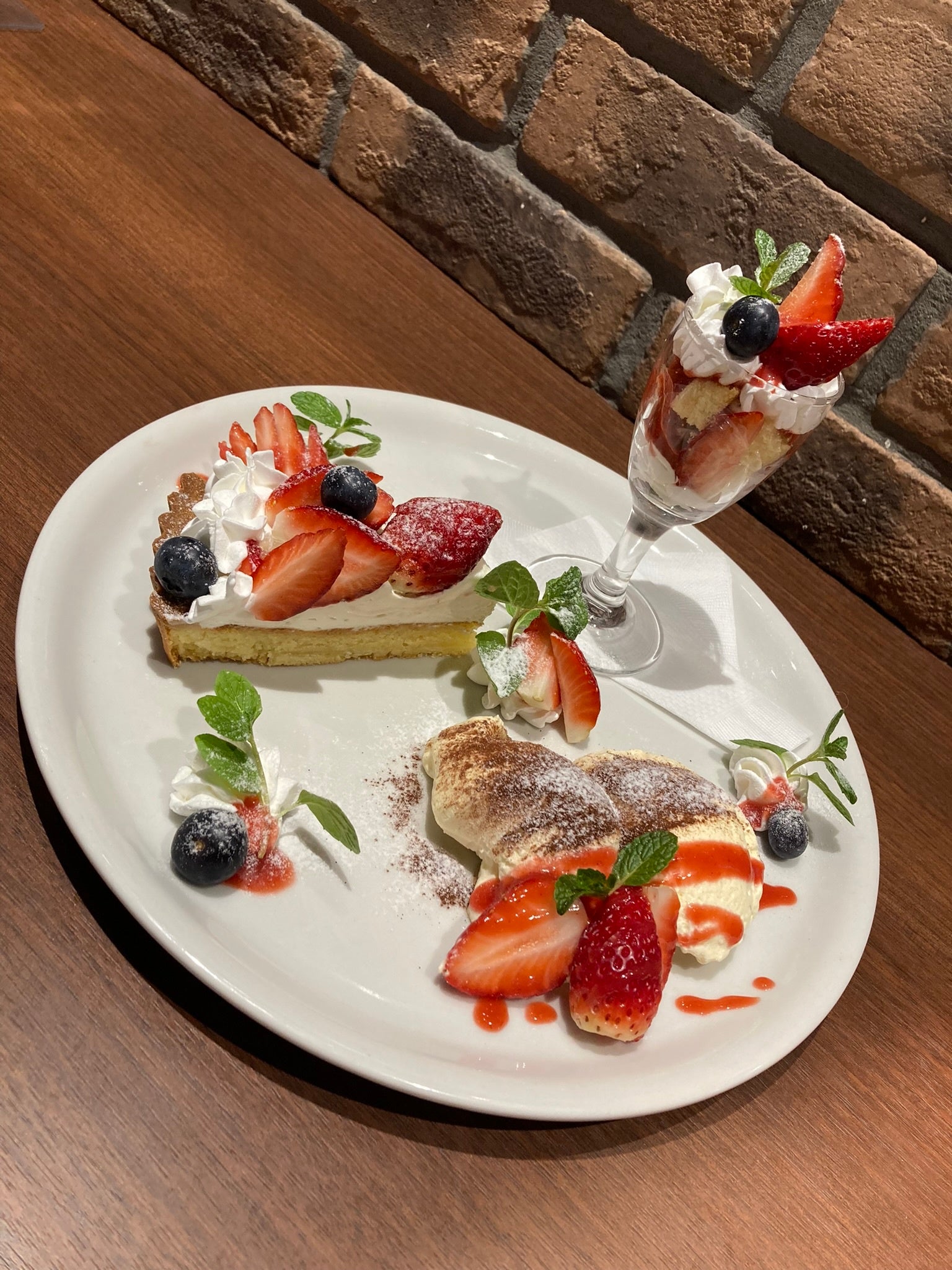 3種類のケーキとアイスにイチゴを合わせた一品。