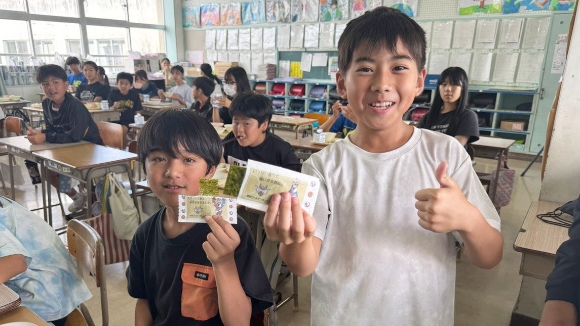 当日は、6年生と4年生の各教室を訪れ、子どもたちに直接「キングスデザイン海苔」をお届けしました。給食を食べる様子も見学させていただき、「美味しい!たくさん食べるね!」という嬉しい反応も見ることができました。