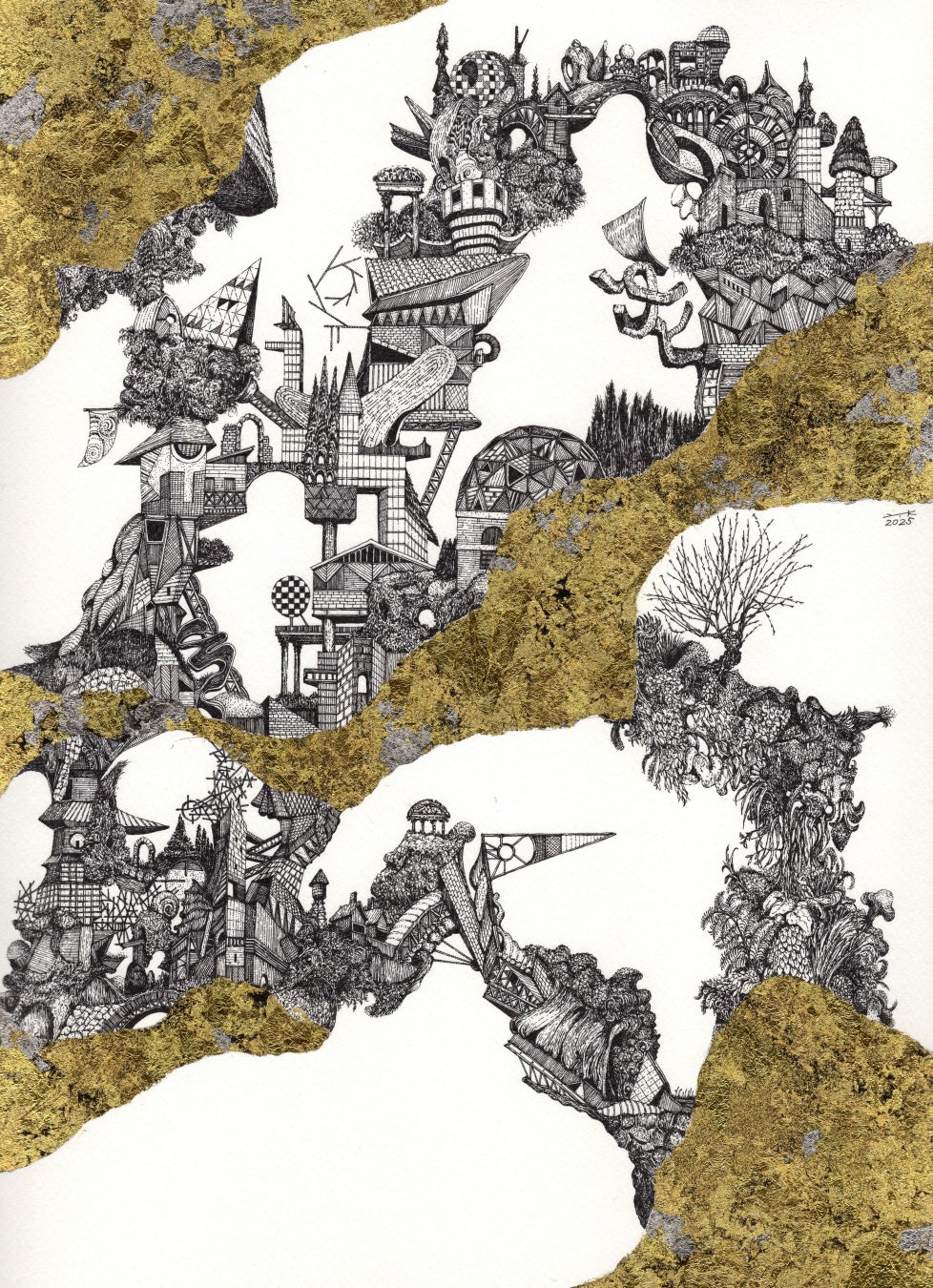 光嶋裕介は、建築家と作家というふたつの顔を持つアーティストです。建築家にとって描くことは世界を知るための大切な要素と捉え、一貫して「幻想都市風景」をテーマにした版画作品およびドローイング作品を手掛けています。5月11日(日)まで京都市京セラ美術館で開催されている「第4回 PATinKyoto 京都版画トリエンナーレ 2025」にも出展しています。製図用のペンで緻密に描き込まれたドローイングは、光嶋の内面が投影され、建築家として描くスケッチとは異なる空想的な世界が表現されています。