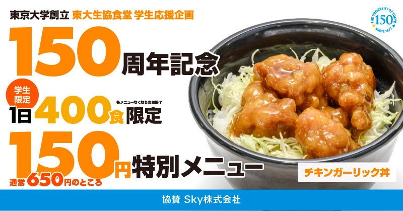 Sky株式会社が「東京大学創立150周年記念」学生応援企画、150円特別メニューの提供に協賛します