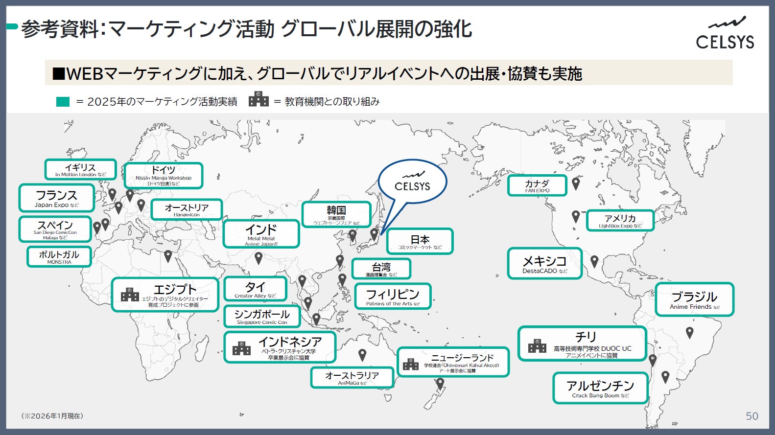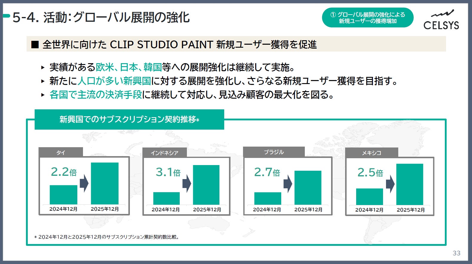 2025年12月期は、各市場に最適化したWebマーケティングに加え、世界20以上の国と地域で開催された約60のリアルイベントやコンテストへの協賛、200名以上の海外クリエイターと提携したインフルエンサーマーケティングを実施しました。特に重点施策地域としている新興国市場においては、サブスクリプション契約が前年比で伸長し、ユーザー数の増加を達成しました。