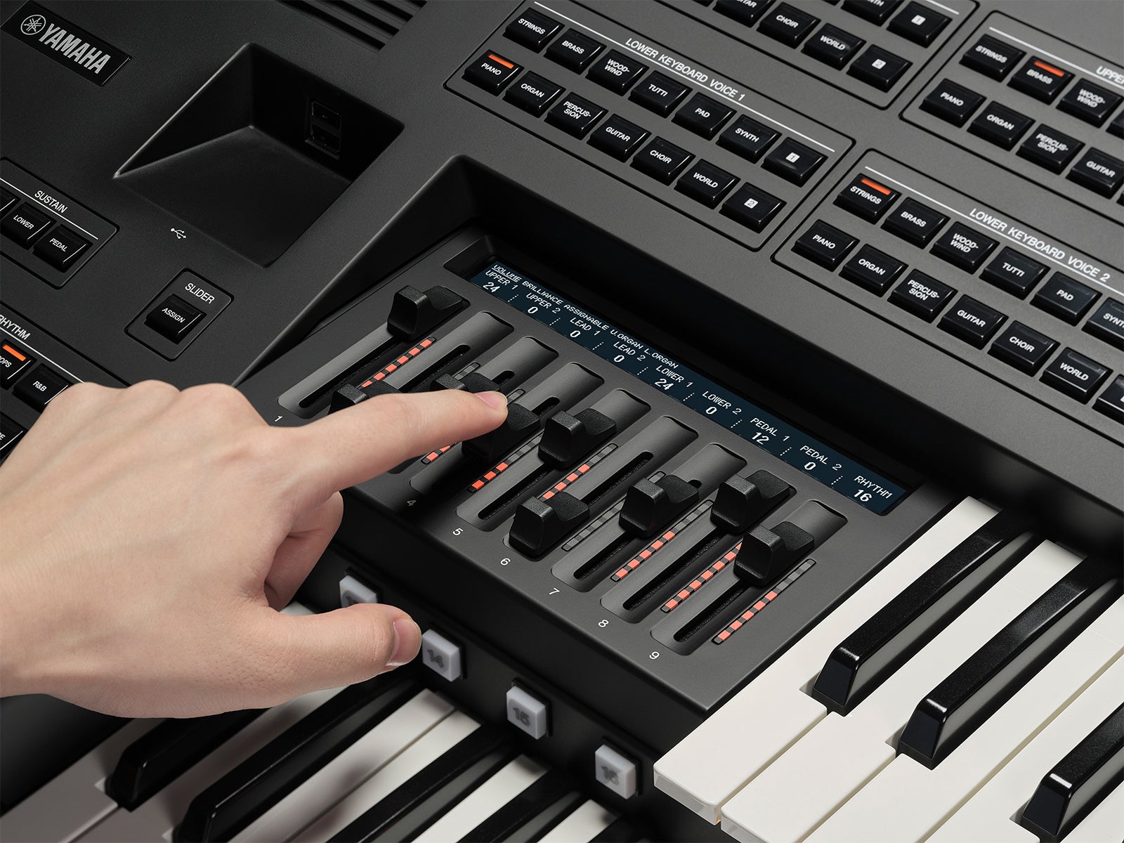 スライダー、エクスプレッションペダル、フットスイッチが音色やリズムを多彩に変化させ、繊細なニュアンスからパワフルなサウンド変化まで、演奏者の個性をリアルタイムに表現します。今回初搭載のスライダーでは、物理的なつまみを採用。スライダーならではの直感的で自在な操作性が、自由で変化に富んだ演奏表現を実現します。