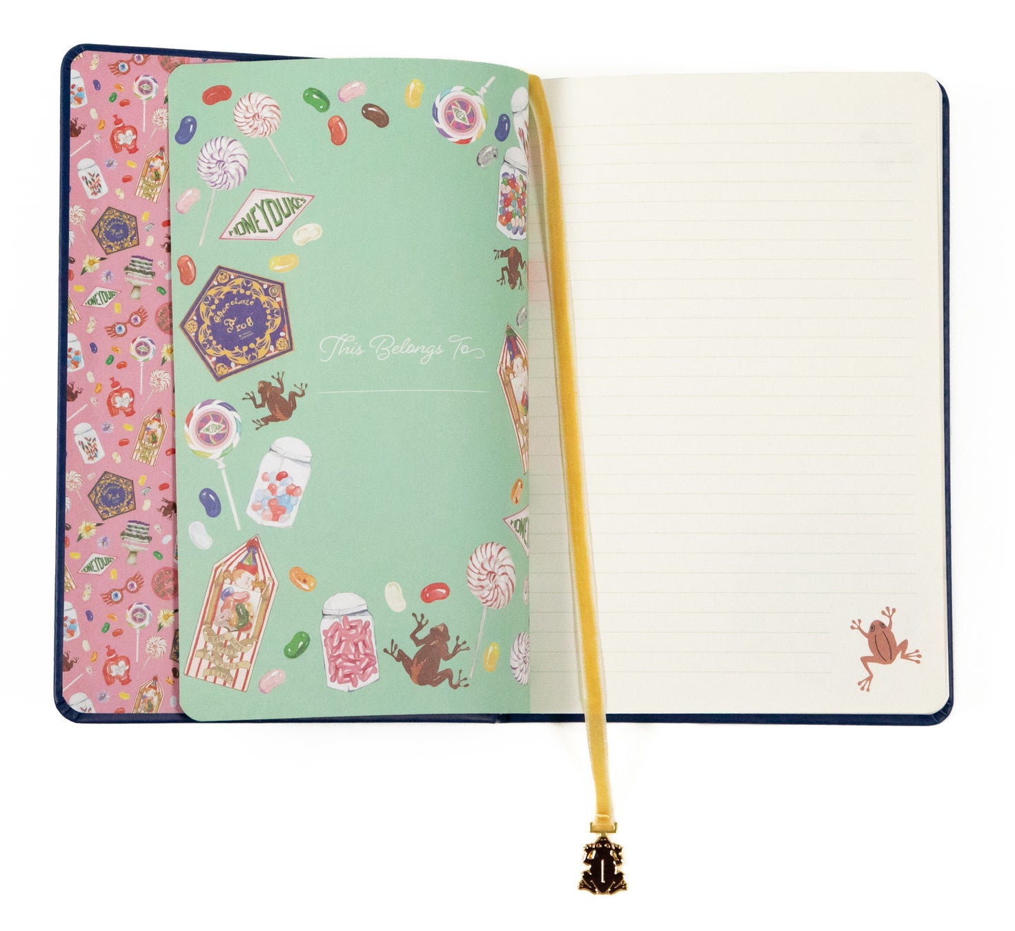 ベルベットリボンのスピン(しおりひも)に、カエルチョコレートのエナメル加工メタルチャーム付き。ノート部分はオールカラーで、カエルチョコレートやバーティー・ボッツの百味ビーンズなどハニーデュークスのお菓子があしらわれています。罫線入りのページになっており、日記や雑記、レシピノートなどさまざまなメモや記録を記すのにぴったりです。