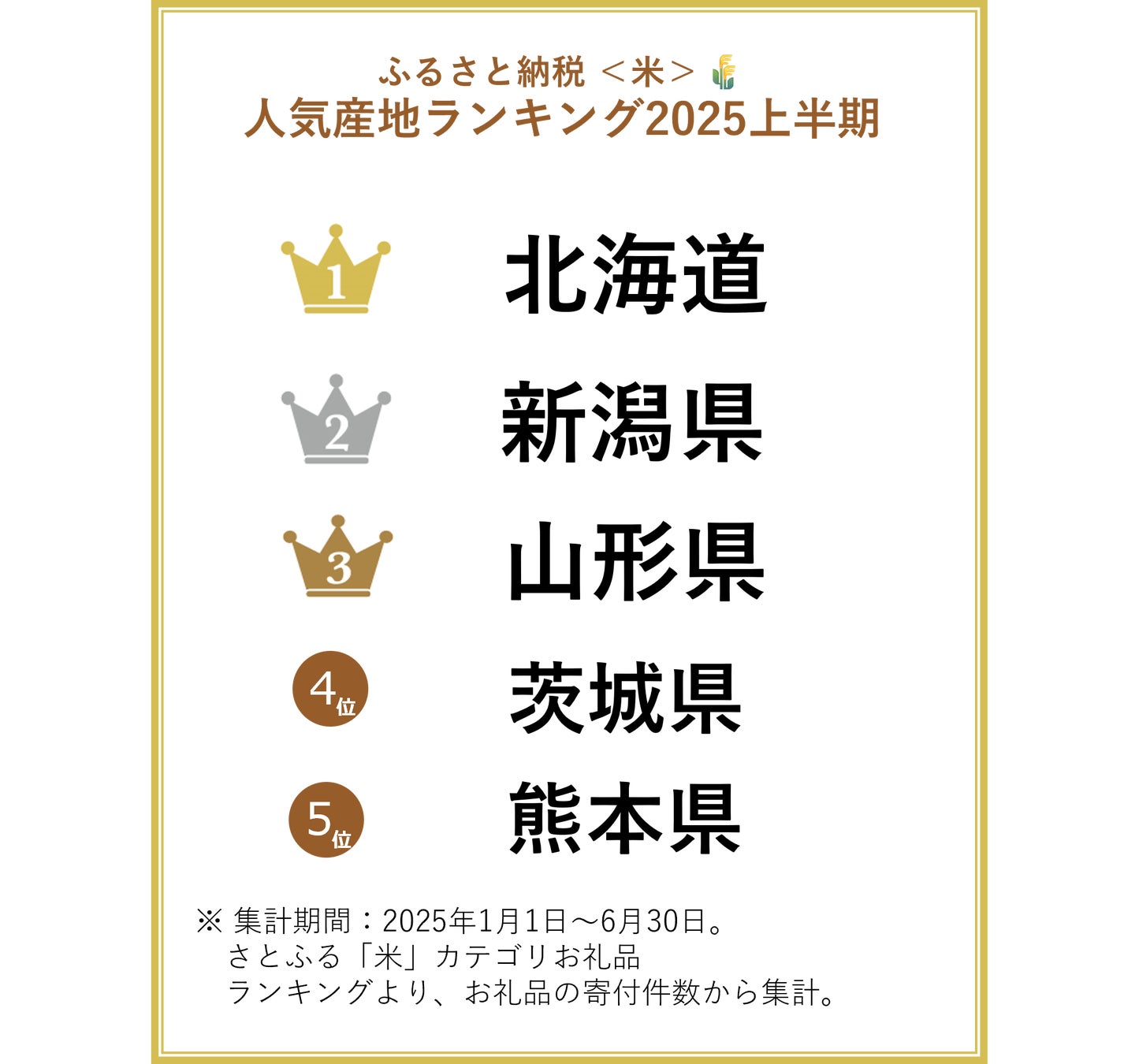 ふるさと納税において、「米」は年間を通じて高い人気を誇っています。2025年上半期の「米」カテゴリお礼品の寄付件数をもとにした人気産地ランキングでは、北海道が初めて1位に輝きました。昨年1位だった山形県は3位に、収穫量全国1位の新潟県は2位にランクインし、ランキング順位に大きな変化がみられます。