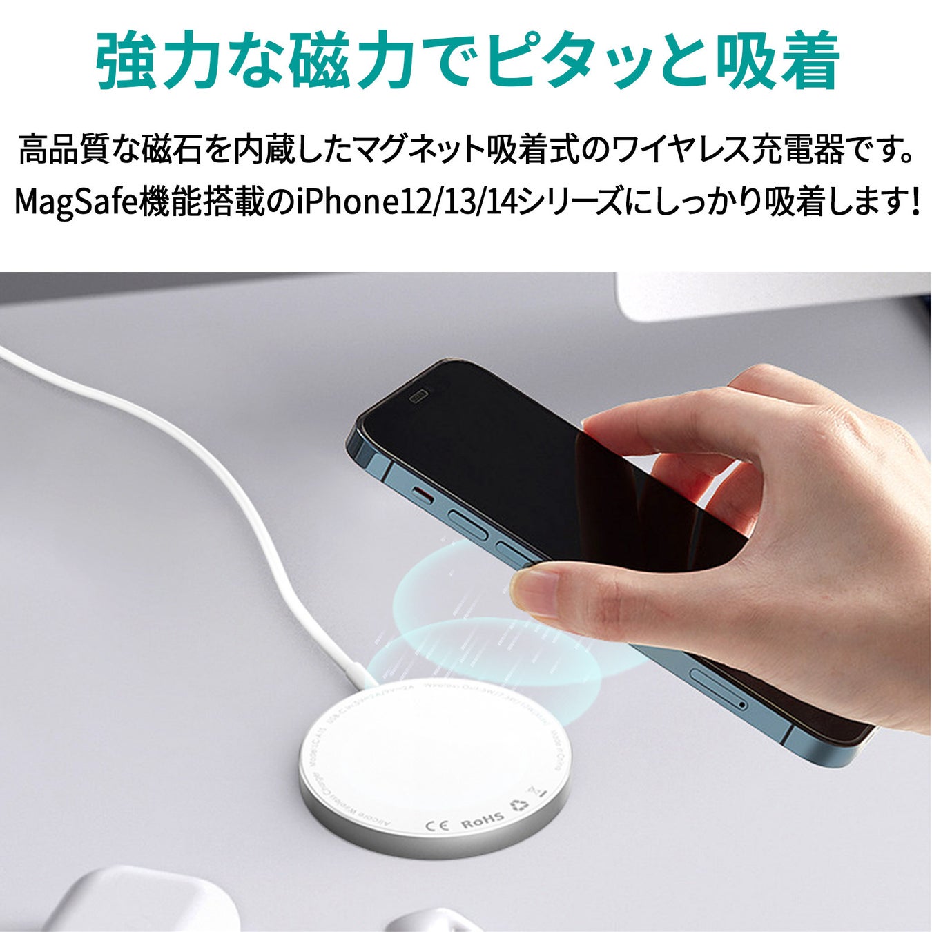 MagSafe機能搭載のiPhone12/13/14シリーズへのご使用にピッタリです。強力な磁力で正確な位置にピタッと吸着し、安全なワイヤレス充電ができます。充電中に機器と充電器がズレないので安定したワイヤレス充電を行えます。
