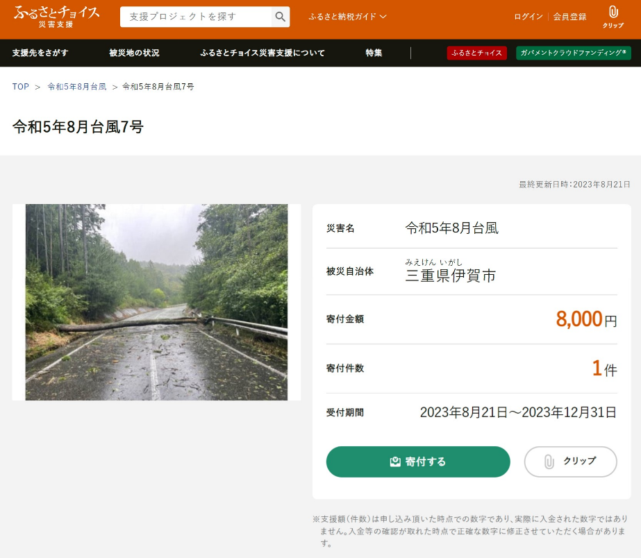 国内最大級のふるさと納税総合サイト「ふるさとチョイス」を企画・運営する株式会社トラストバンク(本社:東京都渋谷区、代表取締役:川村憲一、以下「トラストバンク」)は8月21日、ふるさと納税で被災自治体の災害支援に寄付できる仕組み「ふるさとチョイス災害支援」( https://www.furusato-tax.jp/saigai/ )で、台風7号により被災した三重県伊賀市の「災害時緊急寄付申込みフォーム」を開設しました。寄付金は全額、被災地の復旧・復興に使われます。