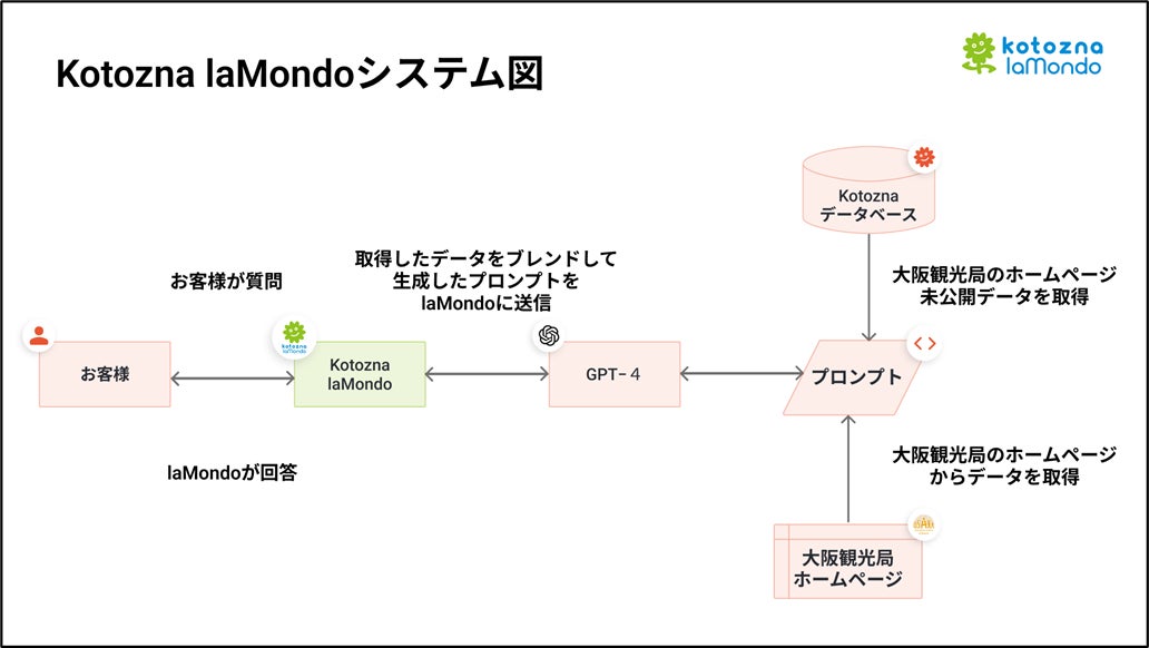 今回導入する、Kotozna株式会社(本社:東京都港区、代表取締役 後藤玄利、以下、Kotozna)が株式会社JTB(本社:東京都品川区、代表取締役 社長執行役員:山北栄二郎、以下、JTB)と連携して提供する、多言語生成系AIチャットボット「Kotozna laMondo(コトツナ ラモンド)」を、