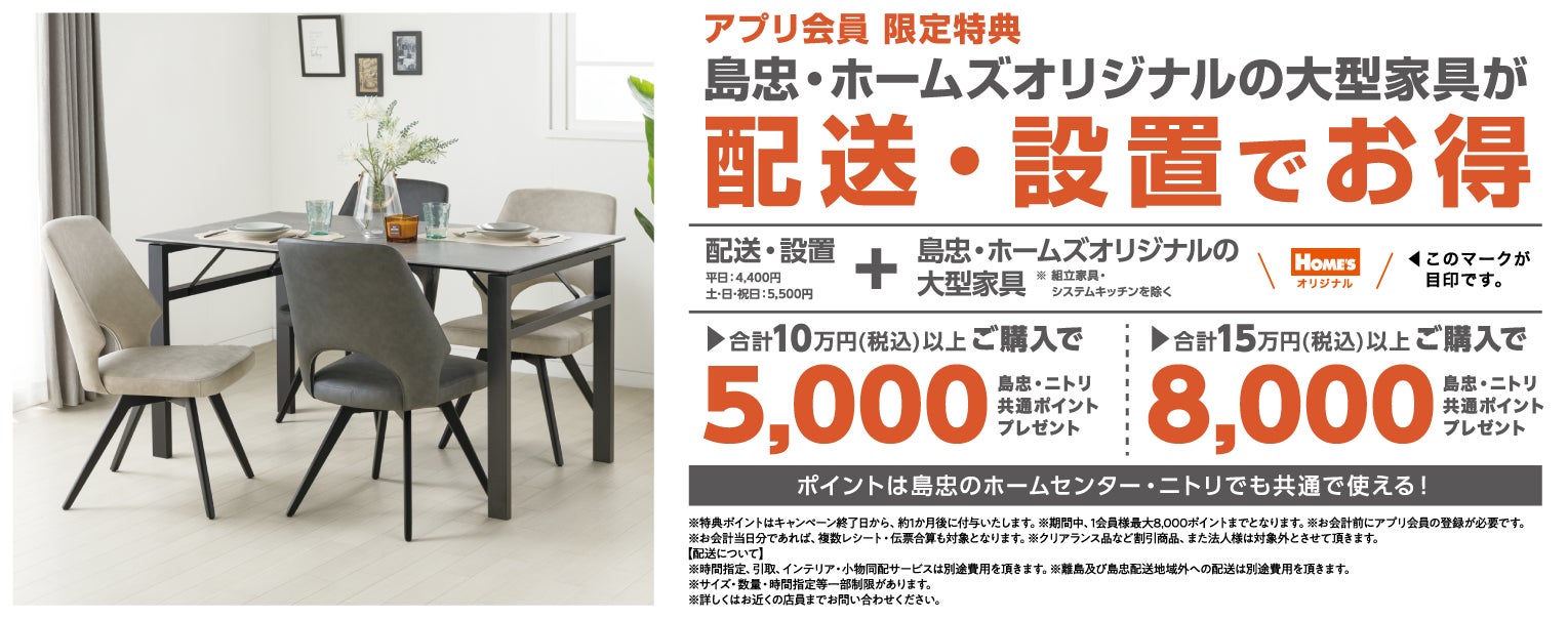 アプリ会員限定特典といたしましては、期間中、配送・設置をお申込みのうえ、対象の島忠・ホームズオリジナルの大型家具を合計10万円(税込)以上ご購入いただくと5,000ポイント、合計15万円(税込)以上ご購入で8,000ポイントをプレゼントいたします(※)。ポイントは島忠・ホームズのホームセンターはもちろん、ニトリでも共通ポイントとしてご利用いただけます。