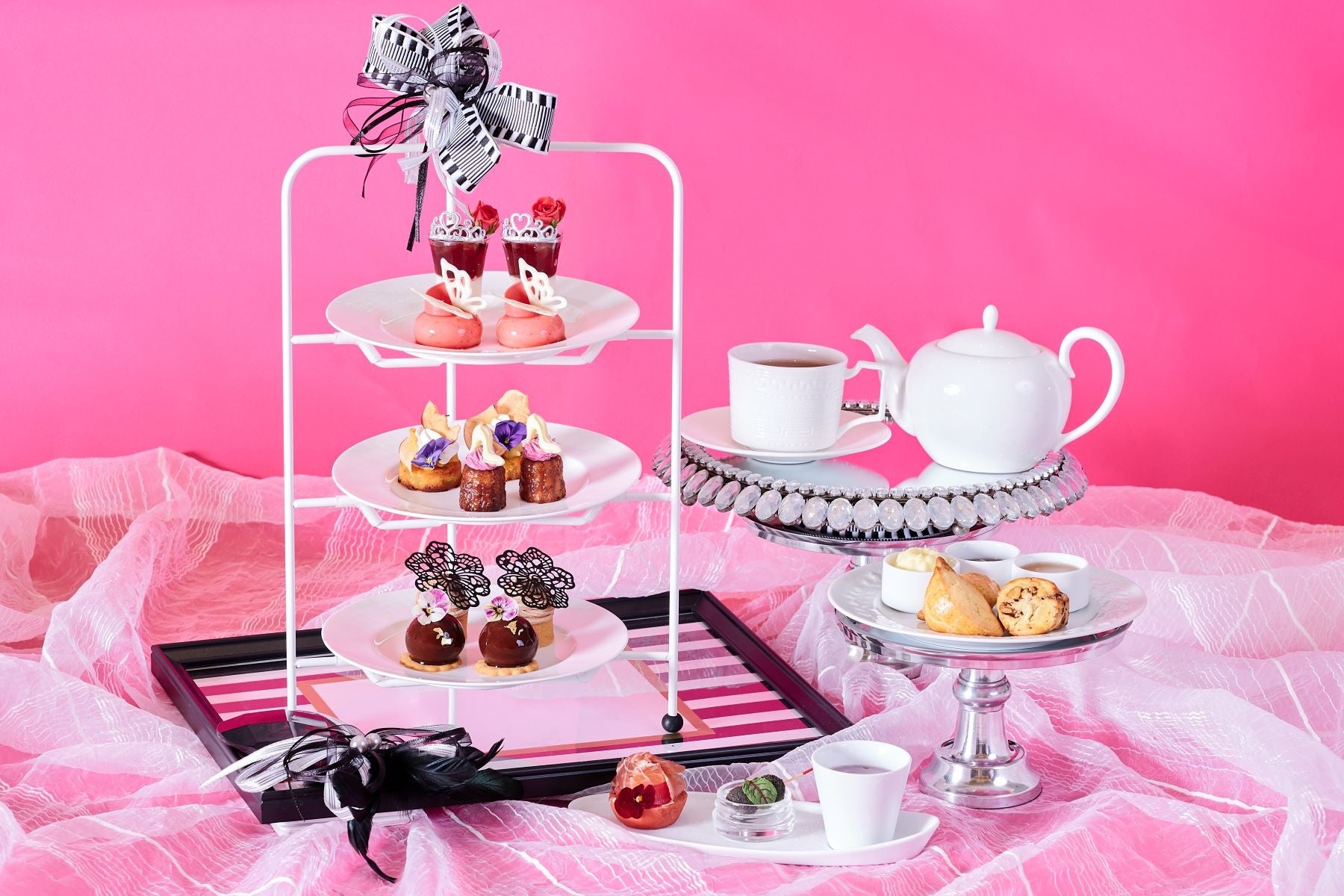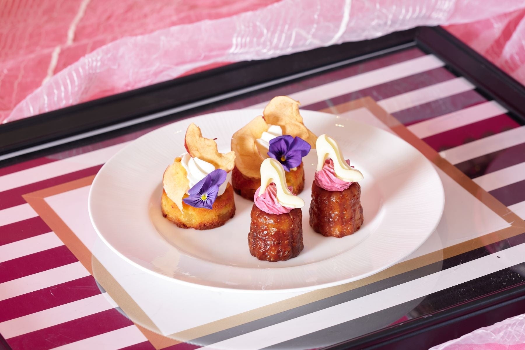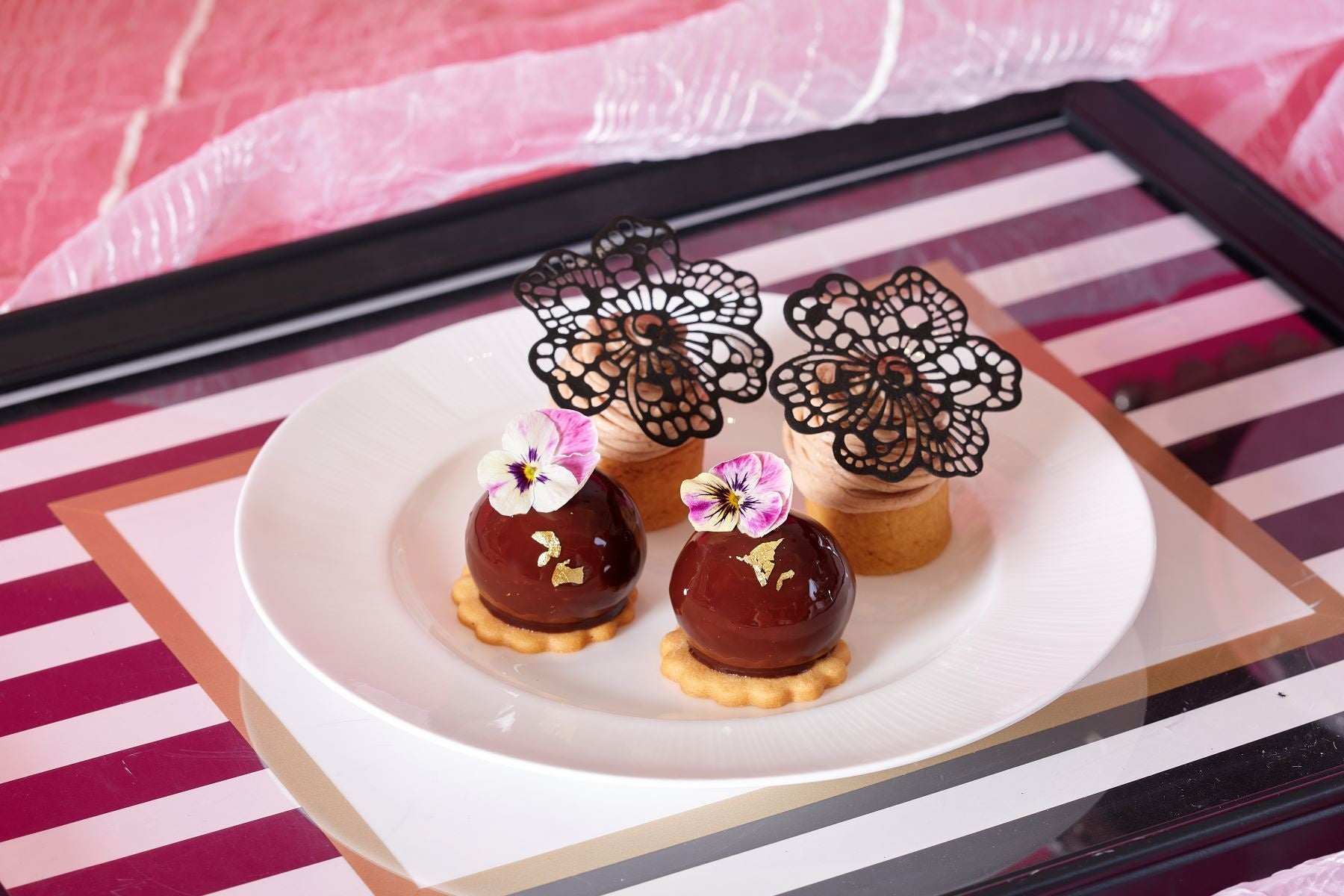 スイーツはぶどうとザクロのジュレをパンナコッタに重ねたヴェリーヌや、滑らかな舌触りの無花果のムース、カシスのバタークリームを乗せたしっとりしたカヌレ、繊細なりんごのチップを飾ったさつまいものタルト、お花を象ったココアのチュイールが目を惹くモンブランの6種をご用意。特製セイボリーには、紫芋を使用したポタージュスープ、オリーブのブラックフリット、ビーツを練り込んだパンと生ハム・クリームチーズのオープンサンドの3種をご堪能いただけます。
