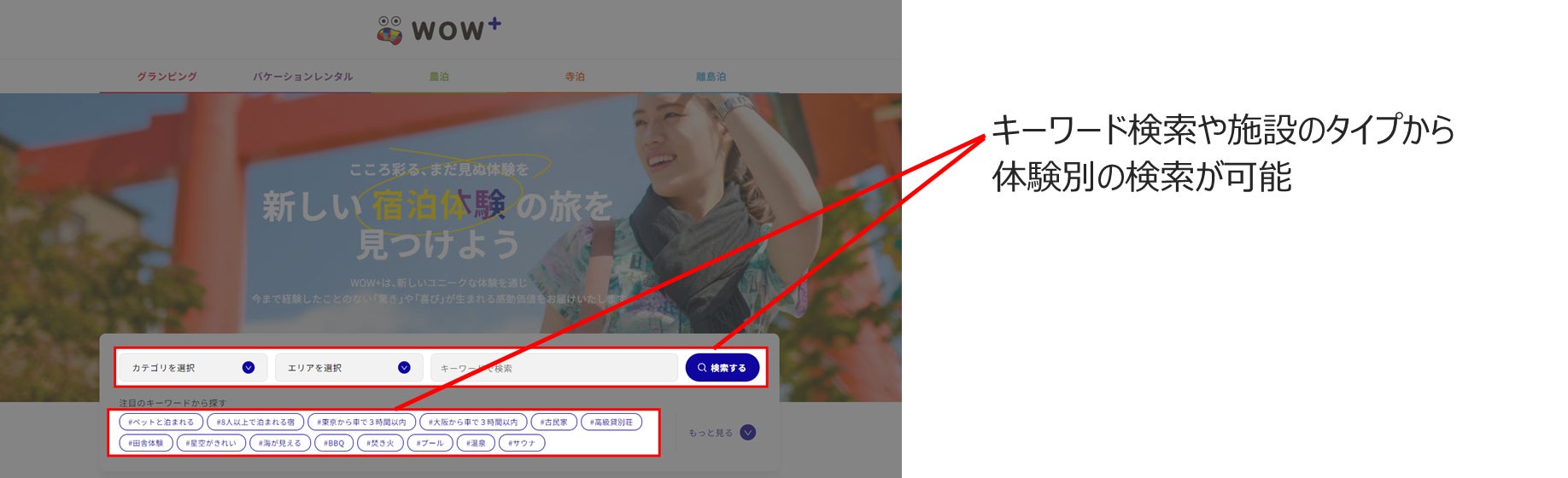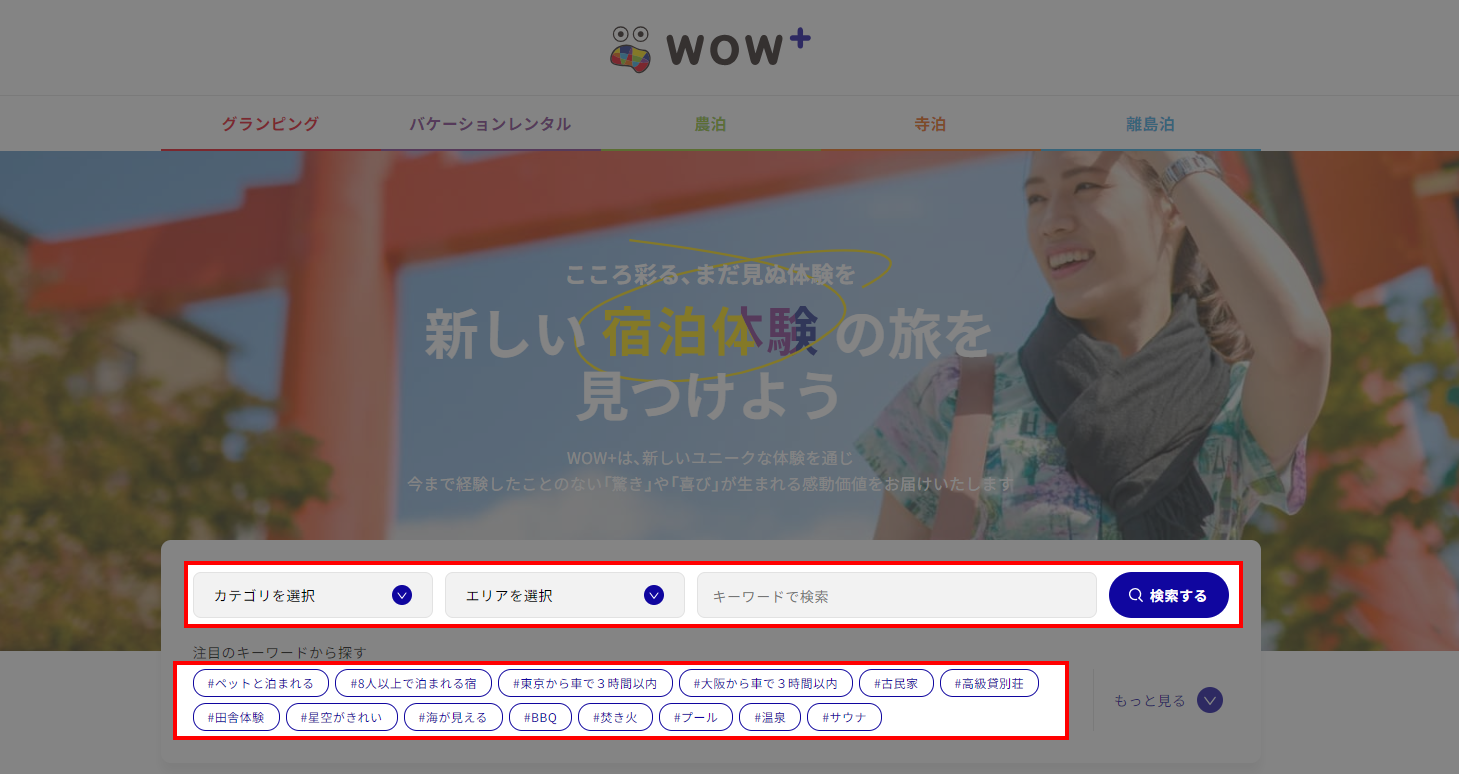 「WOW+」は、“新しい宿泊体験の旅”をコンセプトとした国内宿泊予約サイトで、グランピング施設をはじめ、貸別荘や古民家一棟貸しなどのバケーションレンタル、農業体験を楽しめる農泊施設、お寺の宿坊に滞在できる寺泊施設など、HISが厳選したユニークな宿泊施設に特化したサイトとなっております。掲載する施設を厳選し絞ることで、ユーザーの求める体験から魅力的な施設を検索できます。