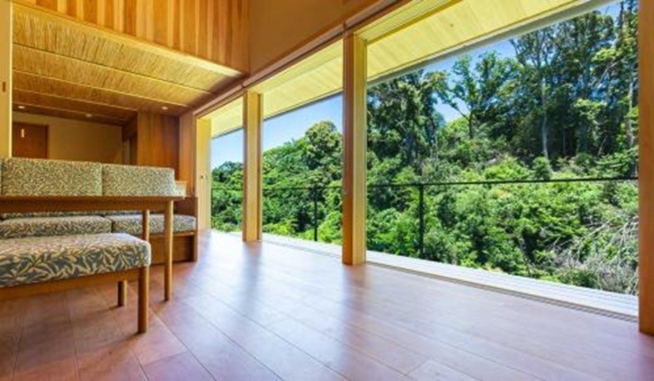 京都東山、400坪の敷地の中に贅沢に佇む一棟貸しの宿。天然木の香りに包まれたお部屋に足を踏み入れると、眼下には雄大な国有林の緑の景色が広がります。