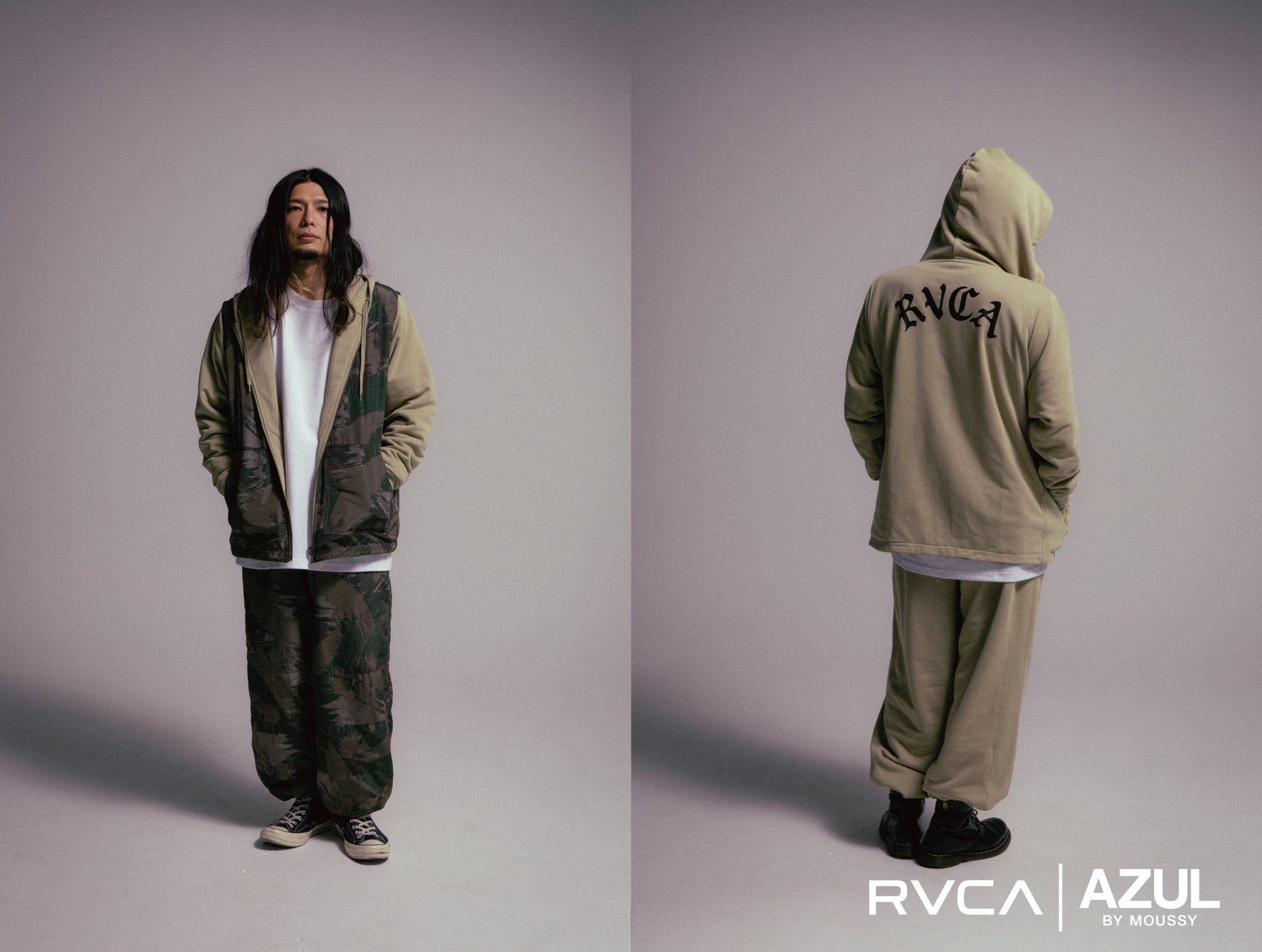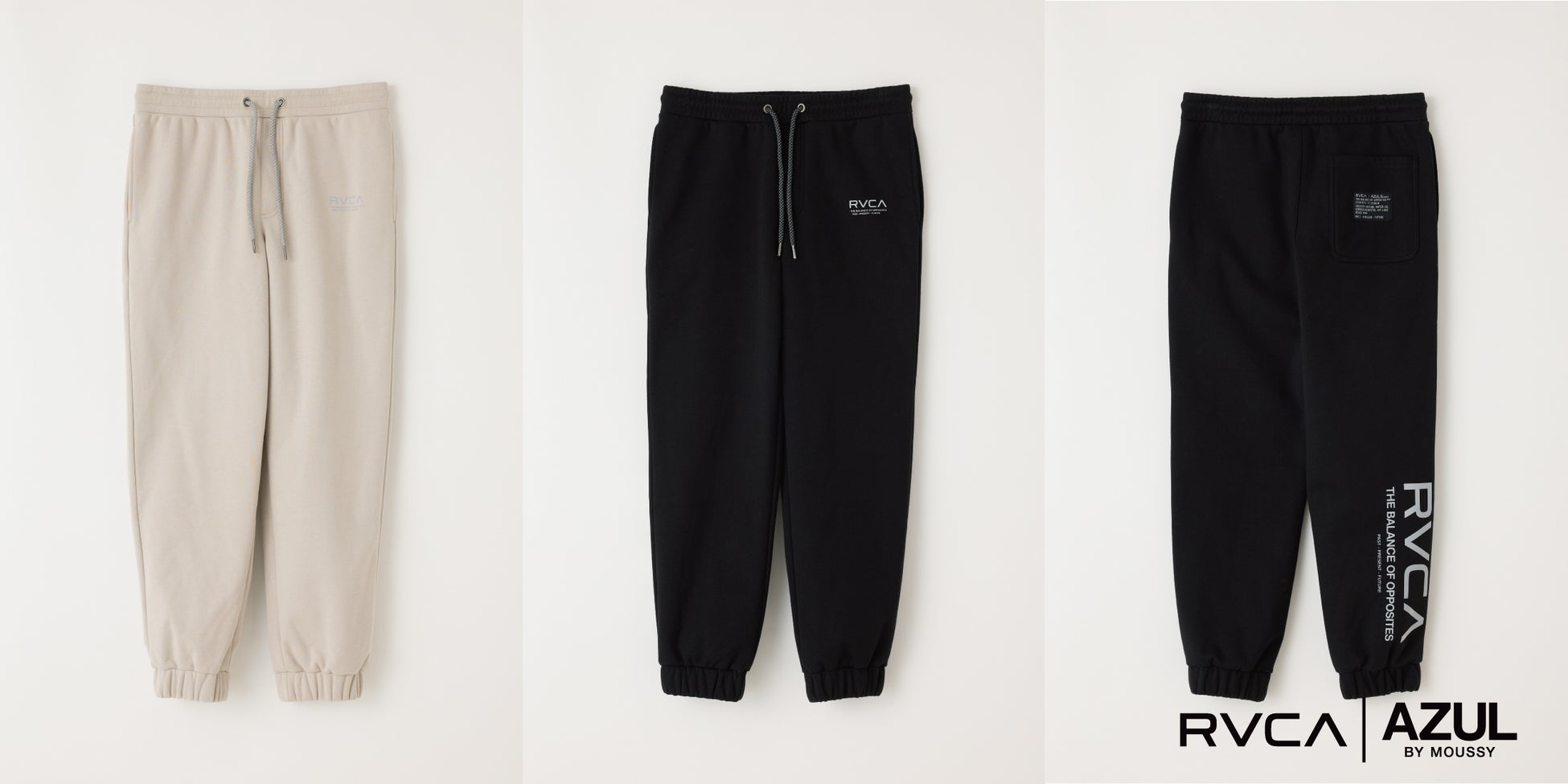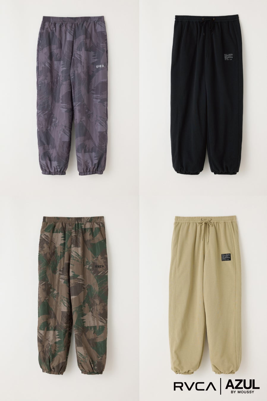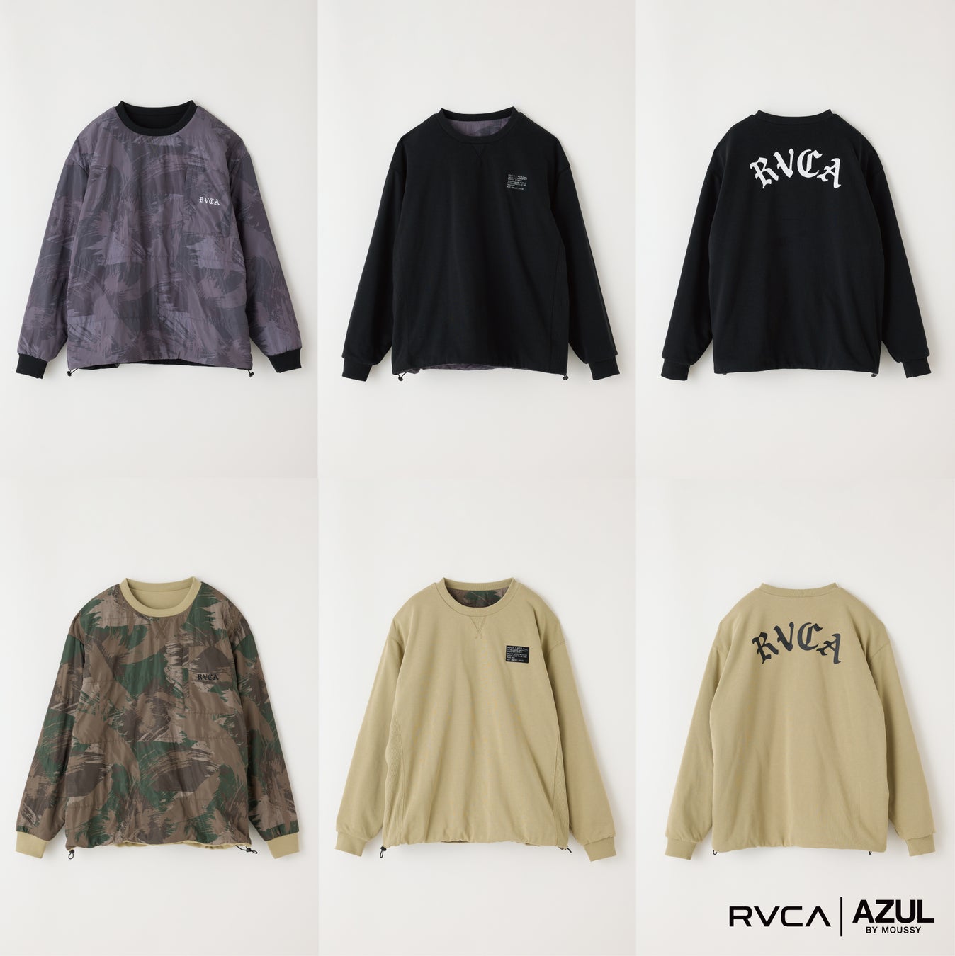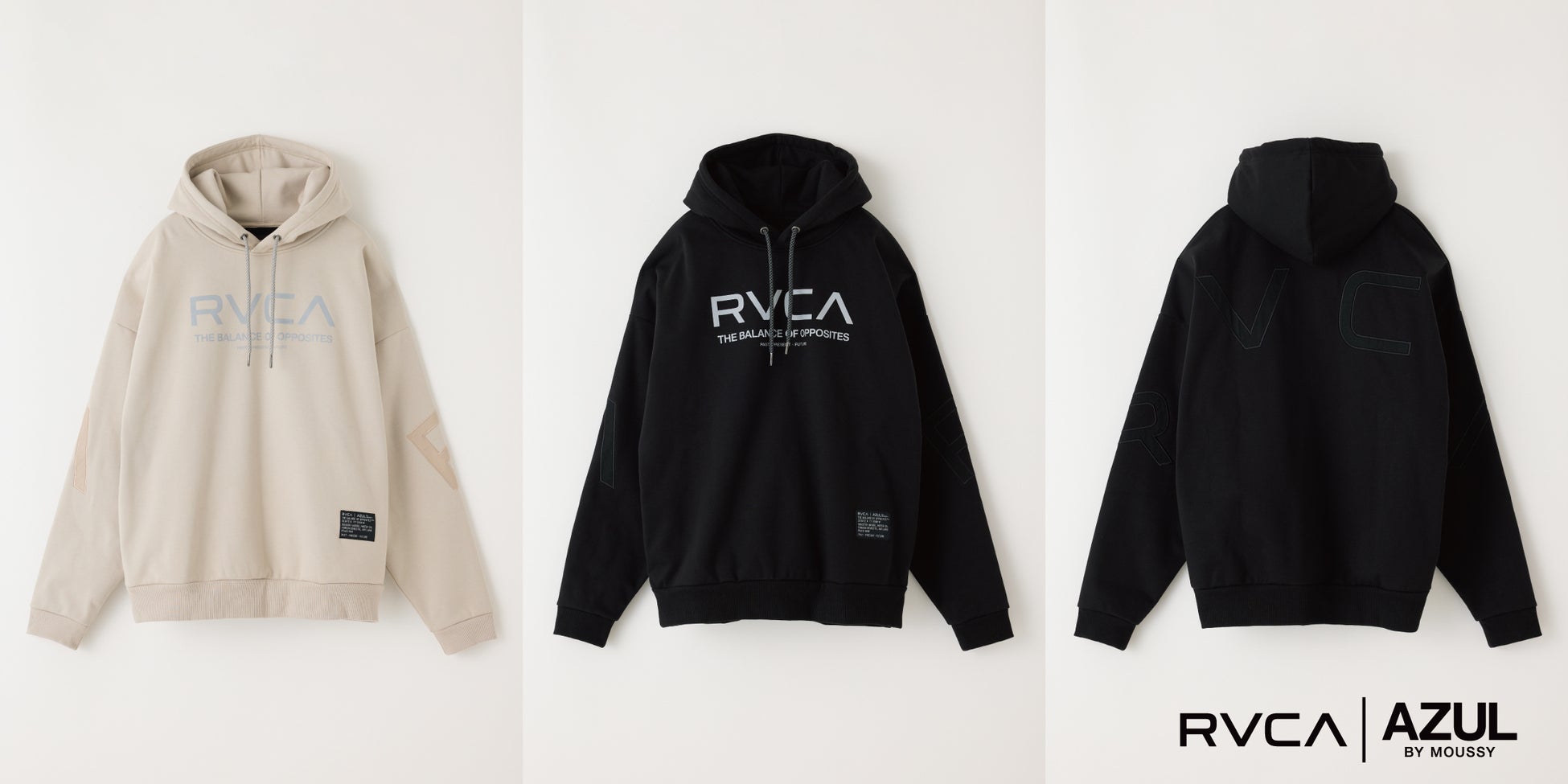 本コラボレーションでは、AZUL BY MOUSSYが持つ都会的で洗練されたスタイルに、RVCAのストリートスピリットを融合。ブランドロゴを引き立てるグラフィックデザインが印象的で、ユニセックスで楽しめるスタイルに仕上がっています。