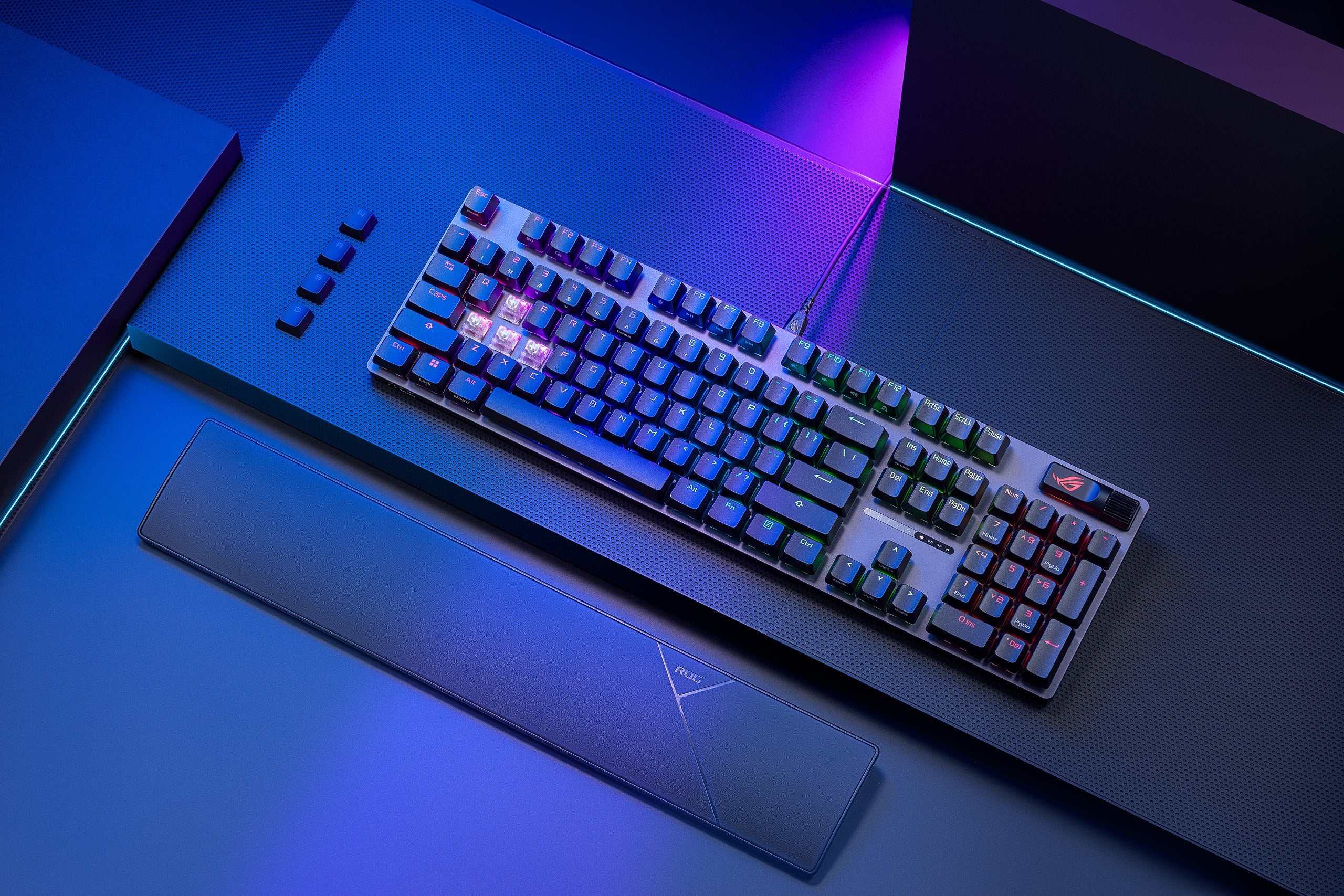 ASUSのゲーミングブランドのRepublic Of GamersよりNX Snow軸を採用したフルサイズキーボードとRX軸専用のPBT素材のキーキャップセットを発表