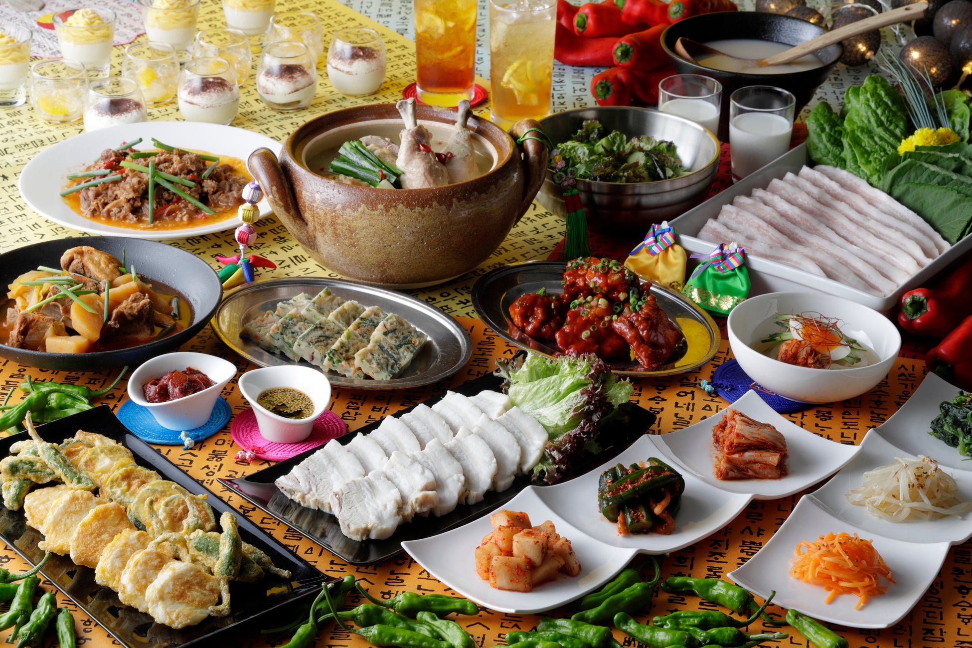 ナムル各種/キムチ各種(鶴橋 豊田商店)/チョレギサラダ/ポッサム/白身魚と野菜のジョン(チヂミ)/ヘムルジョン(海鮮チヂミ)/タッカンマリ/骨付きスペアリブのカムジャタン/プルコギ/サムギョプサル/冷麺/ビビンバ/さつまいもモンブランなど