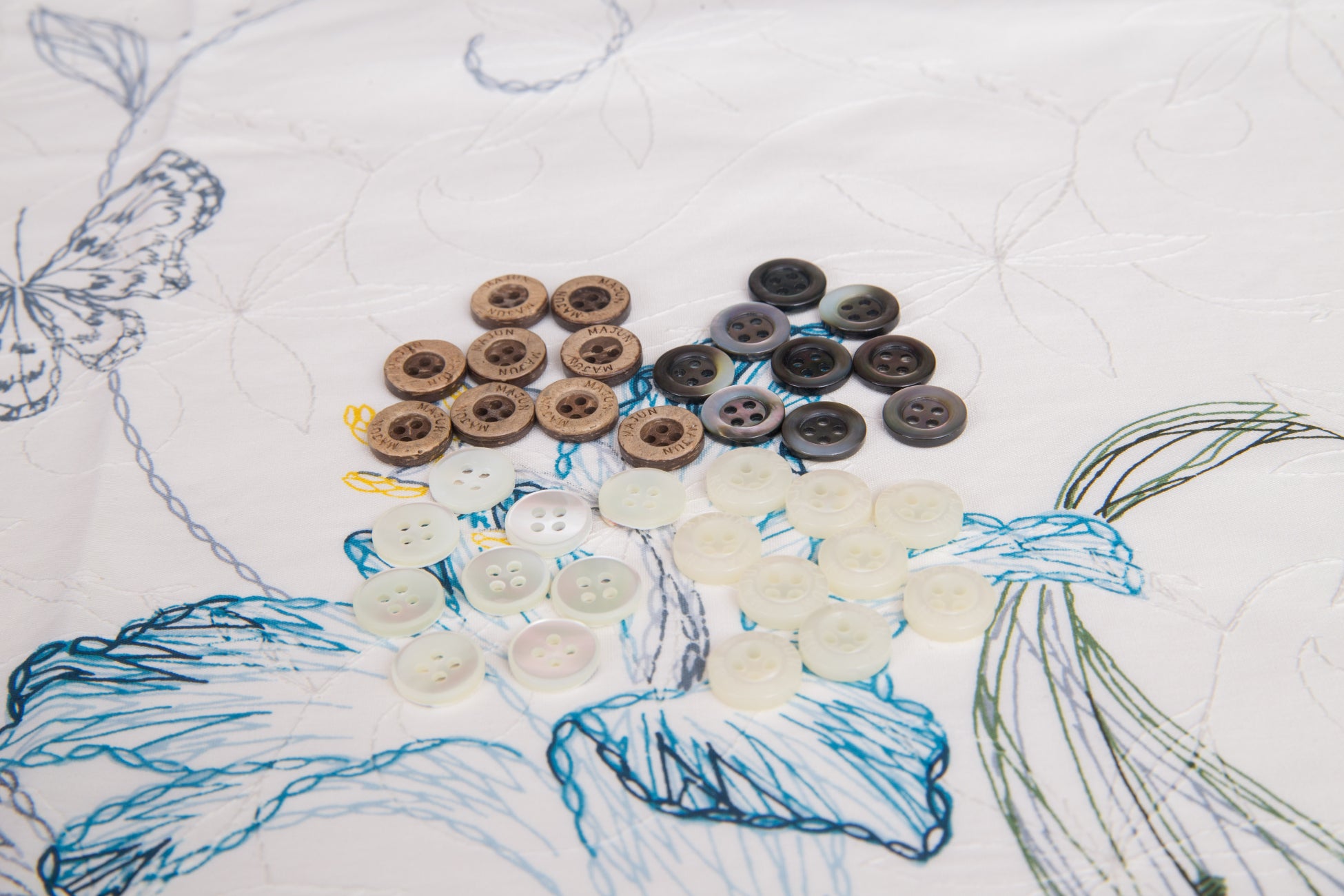 プリントの柄や色に合わせ、ボタンの素材や色合いを選定。ディティールへのこだわりが、より高級感を高めます。