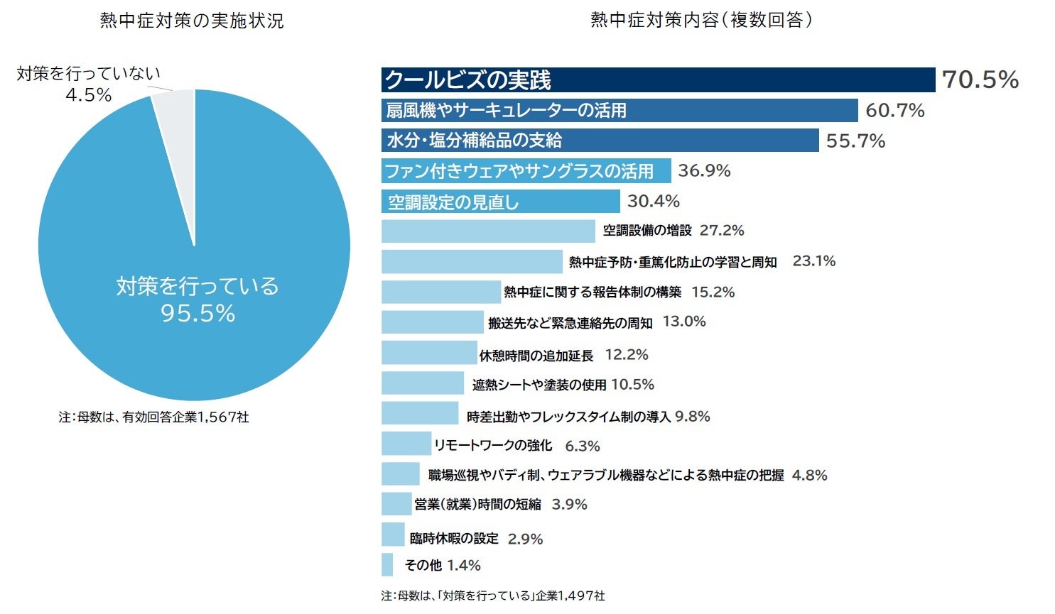 熱中症対策について尋ねたところ、何らかの対策を行っている、または検討している企業は95.5%と9割を超えた。