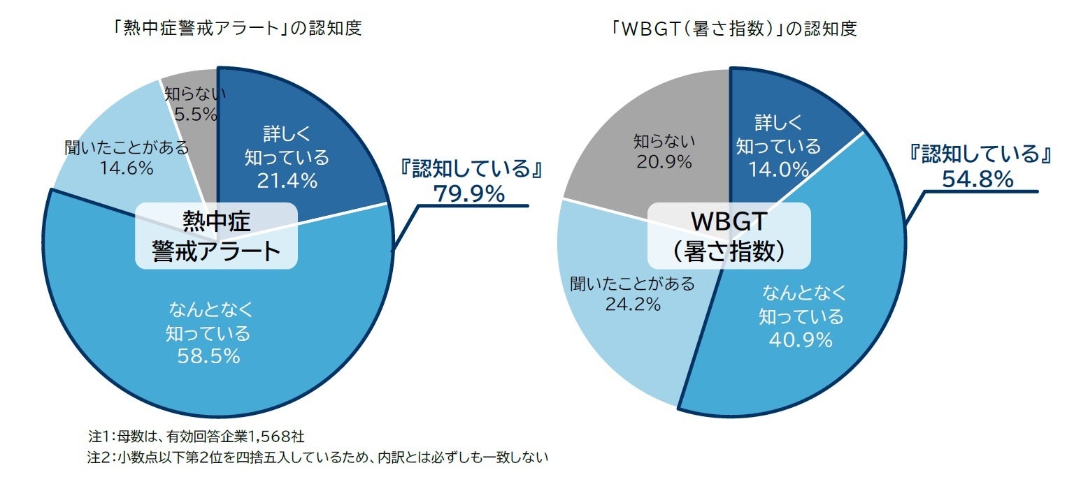 また、「WBGT(暑さ指数)[3]」という言葉を『認知している』企業は54.8%となった一方で、「聞いたことがある」は24.2%、「知らない」は20.9%であり、「熱中症警戒アラート」の発表基準にもなっている「WBGT」の認知度が比較的低い結果となった。