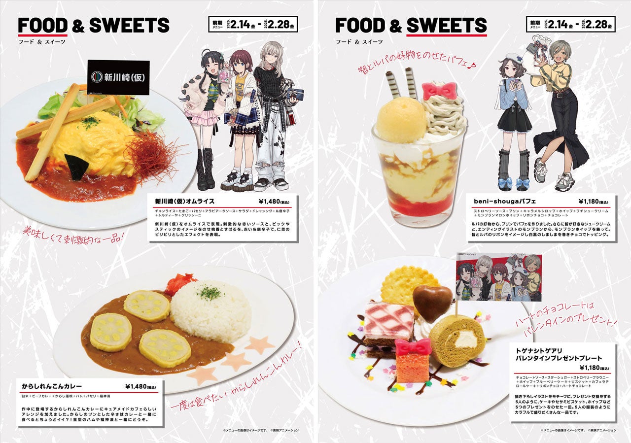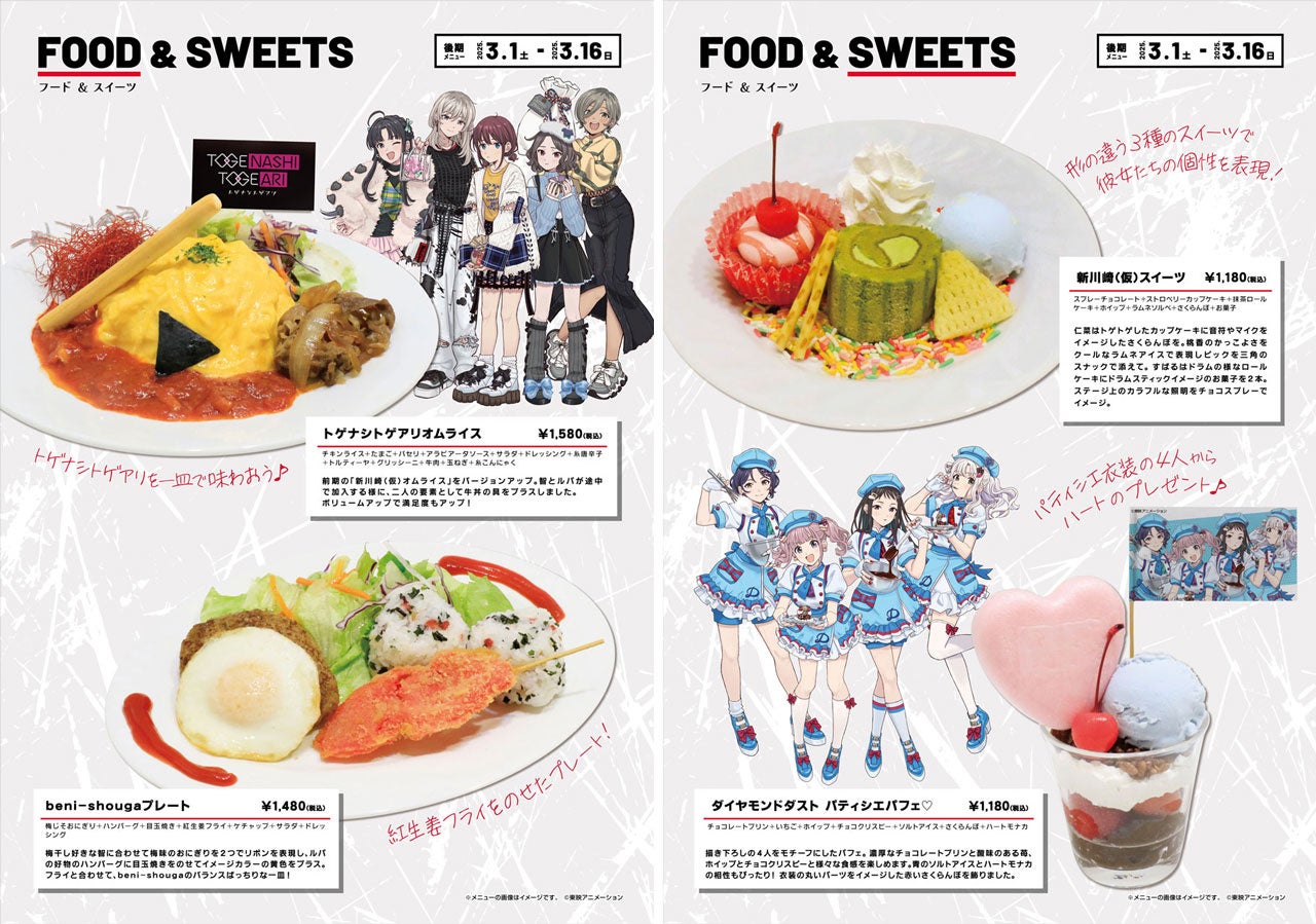 コラボカフェは、[前期] 2月14日(金)~2月28日(金) / [後期] 3月1日(土)~3月16日(日)、仁菜や桃香、トゲナシトゲアリや描き下ろしイラストなどをイメージしたコラボならではのメニューがラインナップいたします。