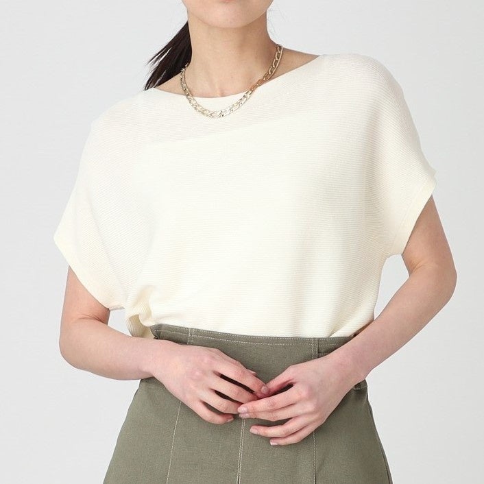 すっきりとしたボートネックデザインが魅力のガーター編みニット。