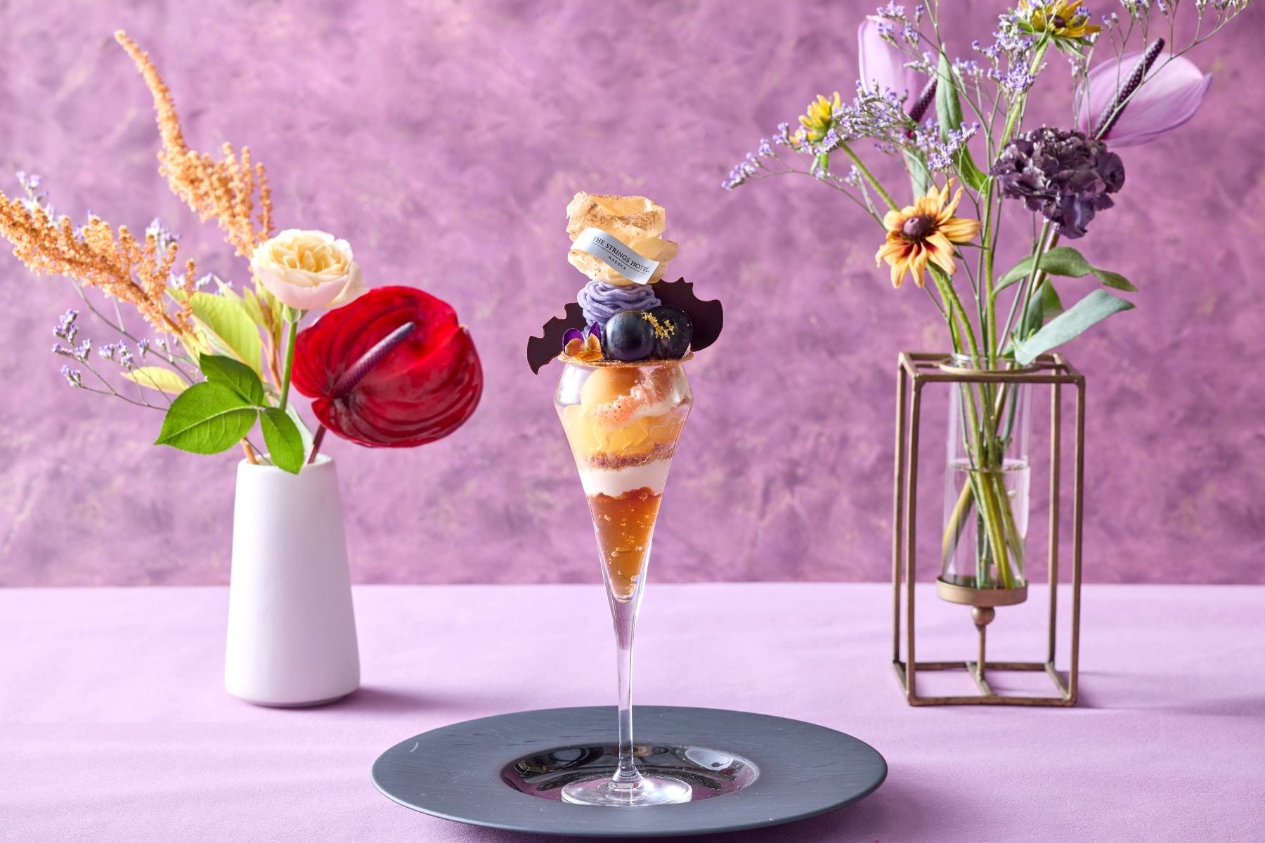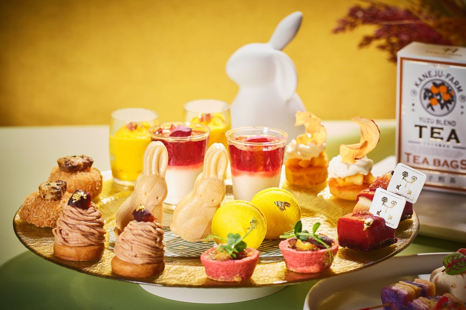 スイーツは、お月見気分を楽しめるうさぎ型の栗と餡子の最中や、満月に見立てたかぼちゃのバタークリームのマカロン、みずみずしい食感のザクロとぶどうのジュレ、繊細なりんごのキャラメリゼを飾ったさつま芋のケーキ、艶やかなラズベリー色の濃厚ショコラムース、カシス香るモンブランの6種をご用意。