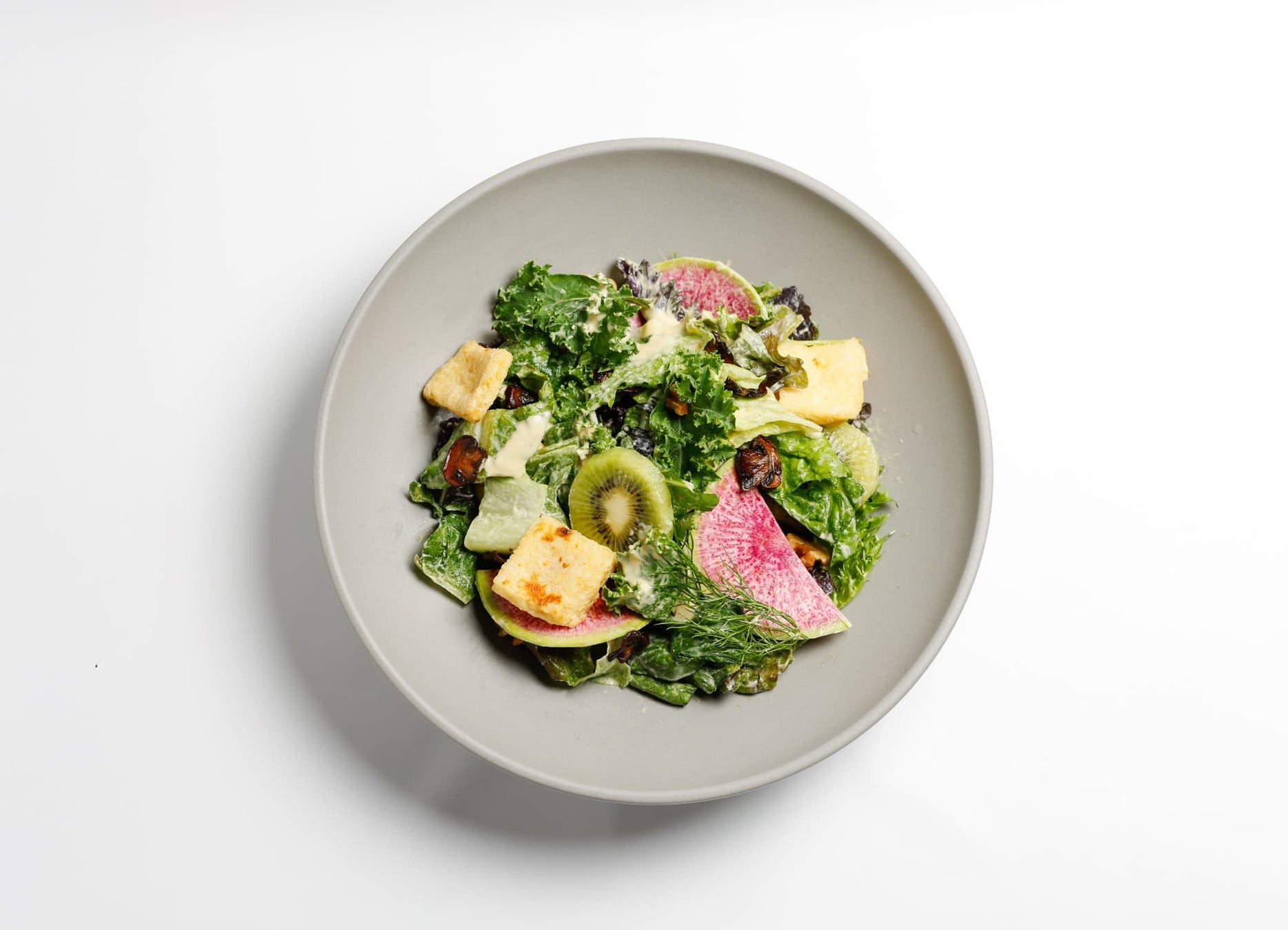 ロメインレタスとケールに、フレッシュなキウイをのせたヴィーガンサラダ。カシューナッツベースのドレッシングや、グルテンフリーのクルトンなど、植物性素材で美味しく仕上げた満足感たっぷりの一皿です。