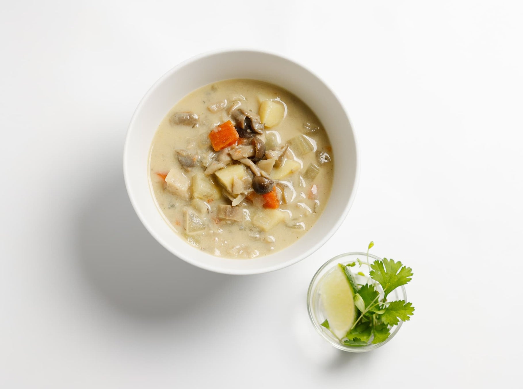 ヴィーガンクラムチャウダー ライム、ベイビーパクチー添え