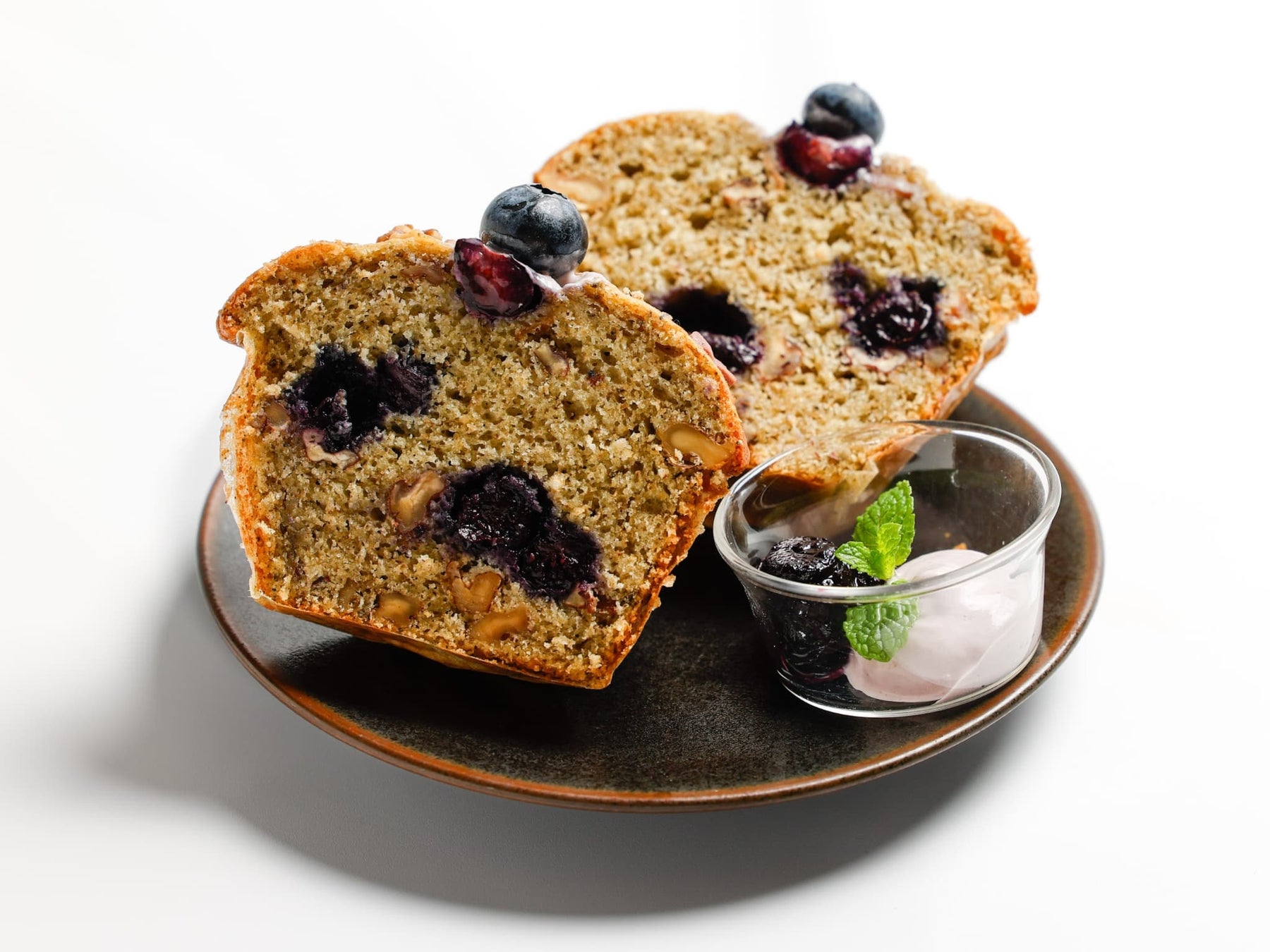 クロモジとジャスミンティーを練り込んだ香り豊かな生地に、ピーカンナッツとくるみの食感をアクセントに加え、ブルーベリー香るビスケットクラストを重ねた、初夏限定のヴィーガンマフィンです。