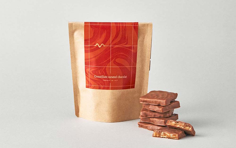 香ばしい食感のキャラメルナッツチョコレート。軽く煮詰めたキャラメルにローストしたアーモンドやくるみを加えてカリっと食感のヌガーに仕上げ、ミルクチョコレートをコーティングしました。なめらかでやさしい味わいのMurirのミルクチョコレートと、ほのかな塩味がアクセントのキャラメル、ナッツの組み合わせが、一度食べるとクセになってしまう、魅惑のおいしさです。