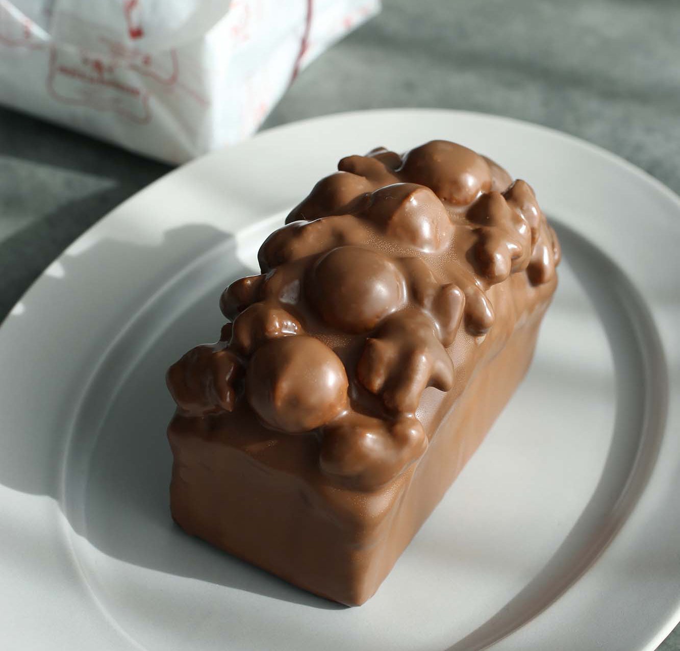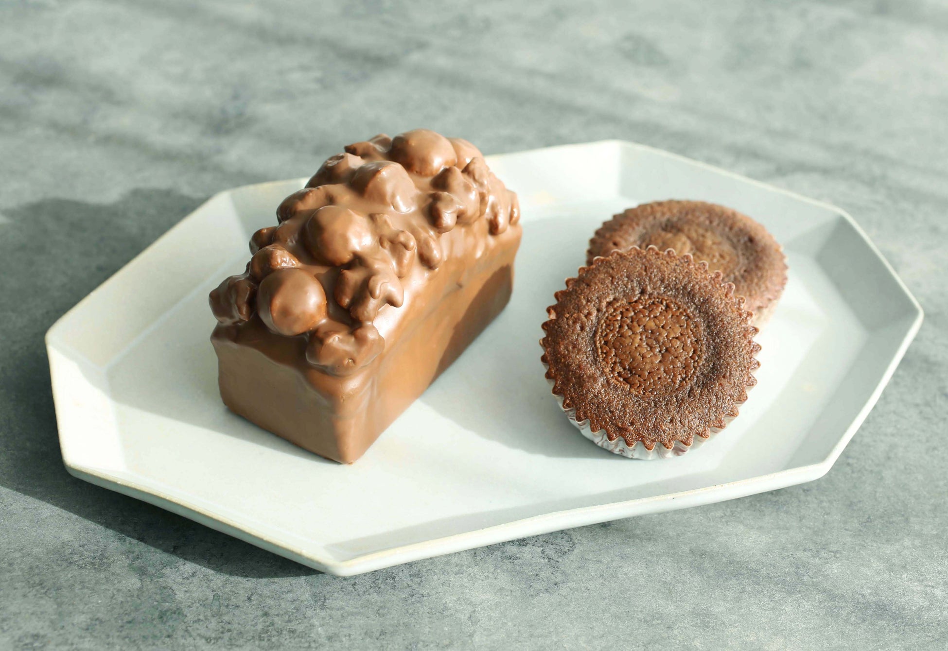 Murirのミルクチョコレートを使用したパウンド生地に、香ばしいマカダミアナッツ・ヌガーとシュトロイゼルをのせ、ミルクチョコレートでコーティングしました。異なる食感が重なり合い、ひと口、もうひと口とフォークを進めたくなるショコラケークです。