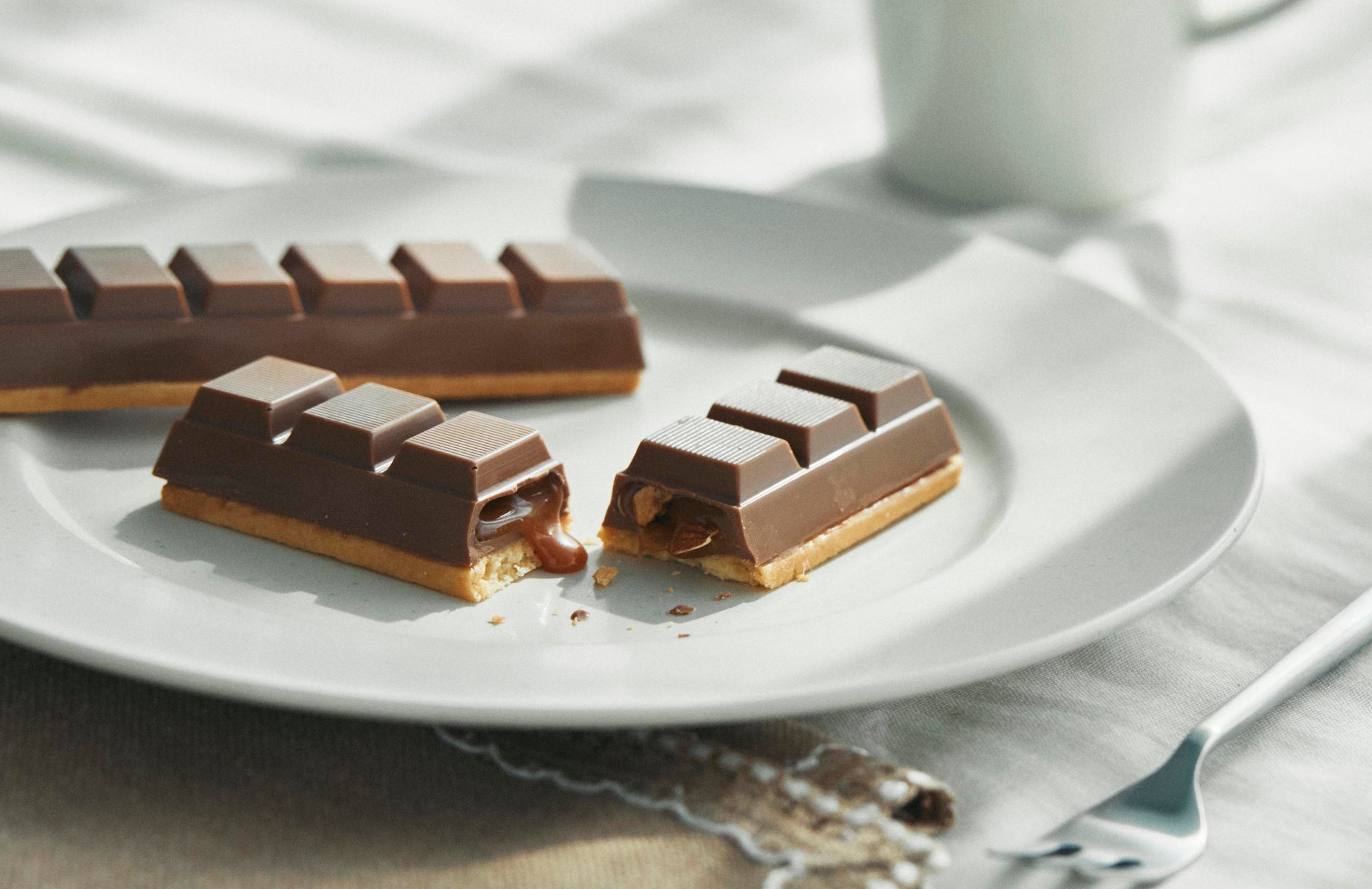 キャラメルの濃厚な甘さに、香ばしいクッキーとナッツの食感がアクセント。なめらかなオリジナルミルクチョコレートが口いっぱいにとろけます。