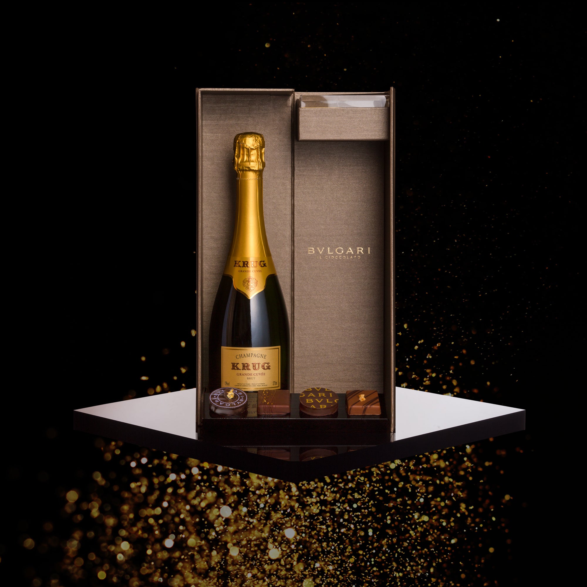 都内にある工房で専属ショコラティエにより製作された4種のチョコレート・ジェムズと1843年創業のシャンパーニュメゾン、クリュッグ「グランド・キュヴェ」のハーフボトルが入った贅沢なセット。