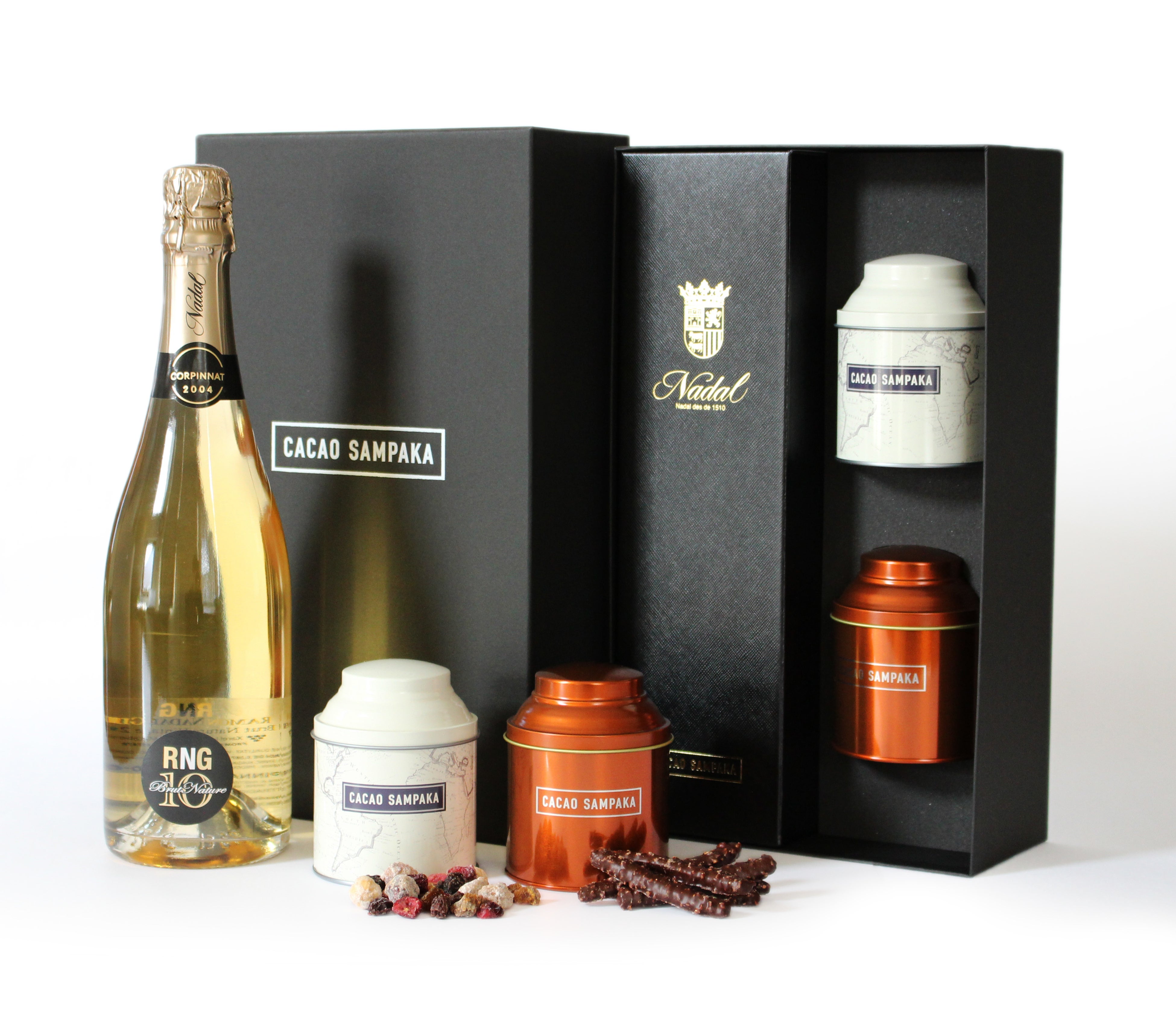スパークリングワインと、4種のナッツとドライフルーツを詰め合わせた缶と、ダークチョコレートコーティングしたオレンジピール缶を組み合わせた豪華セット。ワインは2種類からお選び頂けます。