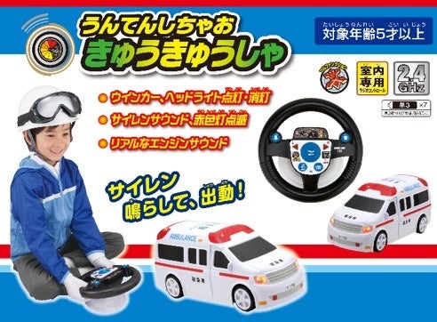 人気のロングラン商品「R/C うんてんしちゃお パトロールカー」「R/C うんてんしちゃお しょうぼうしゃ」に続くシリーズ第3弾商品です。ハンドル型コントローラーで救急車を操縦しよう!ライト、ウインカー、クラクション、サイレンなどのライト&サウンド機能搭載で、本物のような運転遊びが楽しめます。