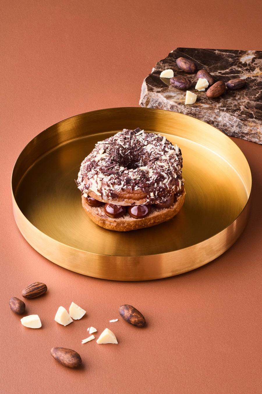 カカオ80%の香り高くビターなチョコレートクリームをたっぷりと詰め、対照的なミルク感あふれるチョコレートに甘味とコクのあるデーツをトッピングしたハート型ドーナツ。チョコレートを練り込んだもちもちの生地に、濃厚なピスタチオのグレーズをかけ、上からフローラルな香りと力強いカカオを感じるチョコレートクリームを絞ったケーキのような大人のドーナツ。食感のアクセントになるよう刻んだホワイト&ダークチョコレートをトッピングした、4種類のチョコレートを堪能できるリッチなイーストドーナツ。選び抜かれた上質なチョコレートの魅力を存分に味わっていただける、満足度の高いラインアップに仕上げました。
