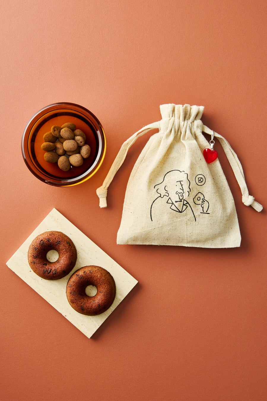 また、『ドーナツ博士』をあしらったオリジナル巾着に、ショコラフィナンシェドーナツとアマンドショコラを詰めたギフトもご用意。バレンタインやホワイトデーシーズンならではのハートチャームを付属した特別仕様です。
