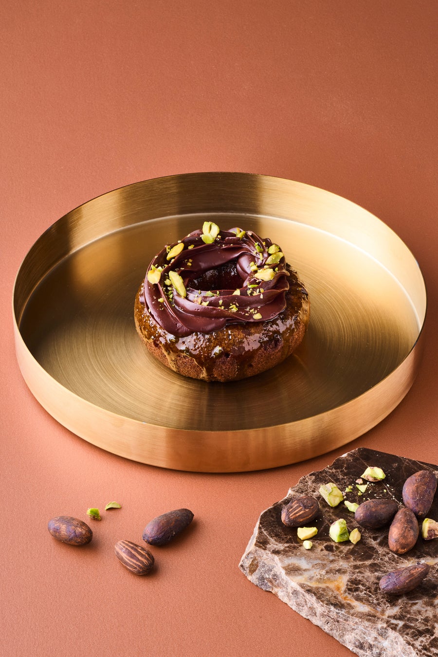 チョコレートを練り込んだもちもちドーナツ生地に、濃厚なピスタチオのグレーズをかけ、上からフローラルな香りと力強いカカオを感じるチョコクリームをたっぷりと絞りました。