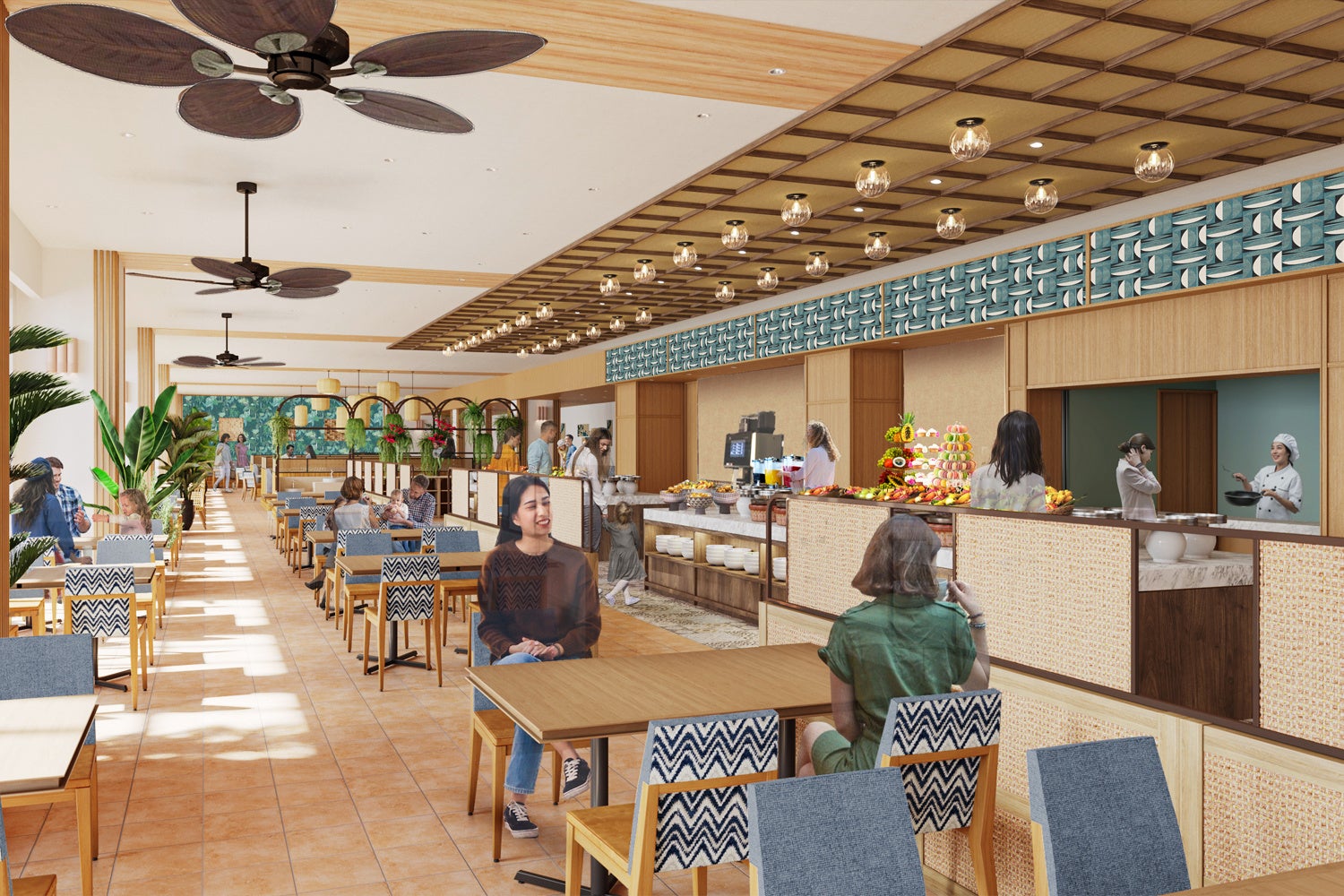 また、各客室には食事や団らんの場となる大きなテーブルを配置し、電子レンジも完備。セルフロッカーやコンビニエンスストアなど「あると便利」な設備・施設や、団体のお客様に対応するラウンジスペースなども備えます。朝食は、開放的な空間で「世界の食を旅するレストラン」をテーマに多国籍ブッフェをご提供。家族連れに嬉しいソファ席も多く、ゆったりとお召し上がりいただけます。