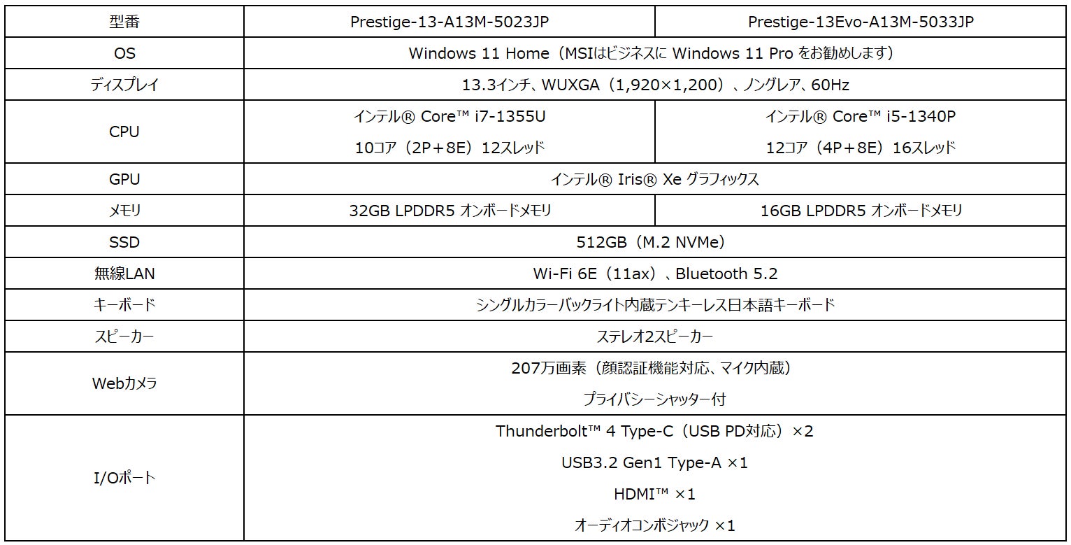 この度、エムエスアイコンピュータージャパン株式会社は、軽さ990gの本体に「第13世代インテル® Core™ プロセッサー」を搭載した13.3インチタイプのパワフルビジネスノートPC「Prestige 13 A13M」シリーズより、i7+32GBメモリ版の「Prestige-13-A13M-5023JP」とi5+16GBメモリ版の「Prestige-13Evo-A13M-5033JP」を2025年1月23日(木)より発売いたします。