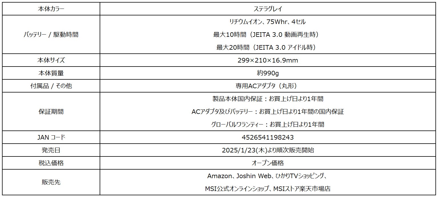 「MSIのビジネスノートPCでも1kg以下のモデルが欲しい」という要望に応えるべく開発がされ、単に薄型・軽量というだけでなく、長時間バッテリー駆動・キーボード配列・セキュリティ機能など細かい部分にも日本からのフィードバックを反映させております。