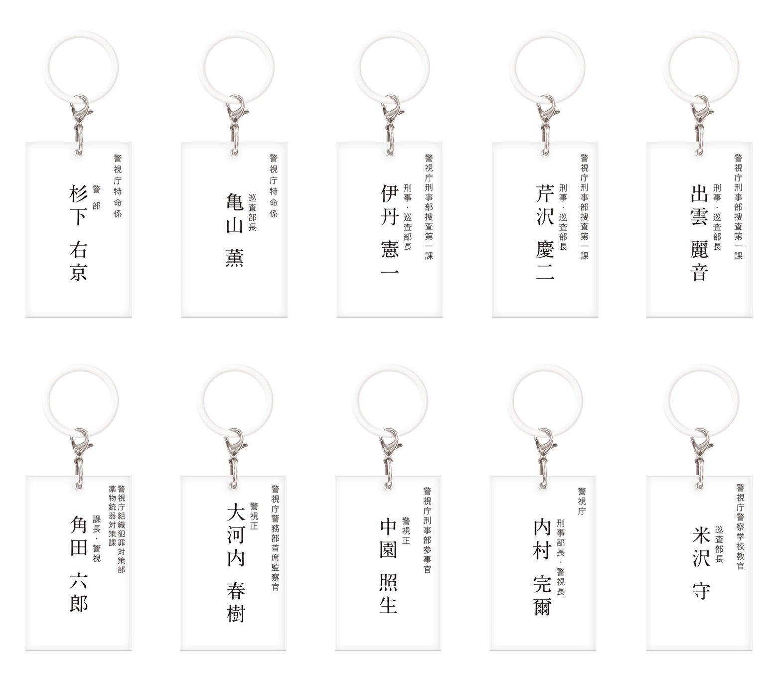 TVドラマ『相棒season24』の名刺風のめじるしチャーム。裏面には『相棒』のロゴがデザインされいています。杉下右京、亀山薫、伊丹憲一、芹沢慶二、出雲麗音、角田六郎、大河内春樹、中園照生、内村完爾、米沢守の全10種類をラインナップ。