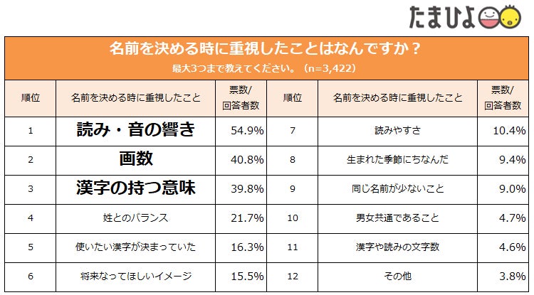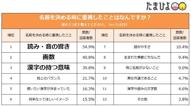 上位3位は昨年と変わらない結果となりました。名前の響きや呼びやすさなど、「読み・音の響き」が名づけで最も重視する項目であることが分かりました。