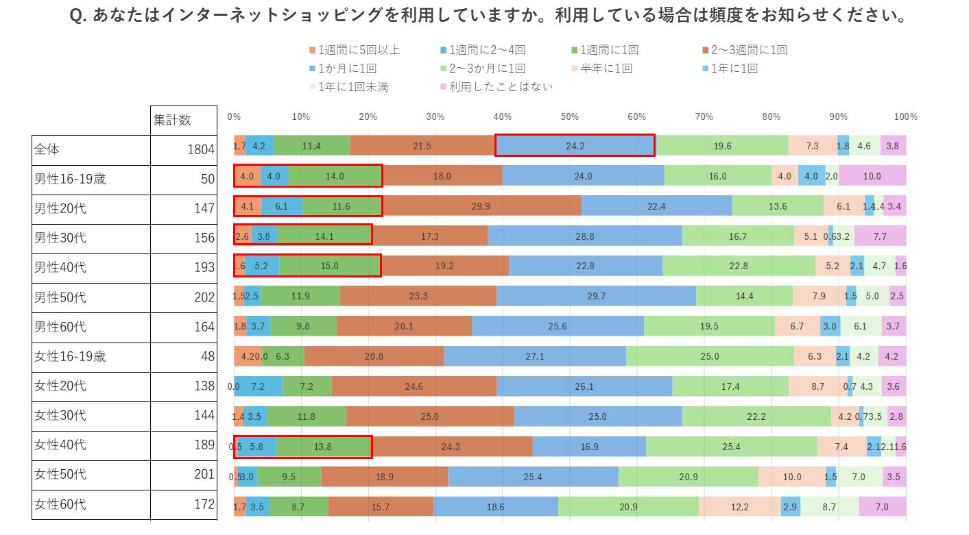 全体では「1か月に1回」が24.2%と最も多くなっています。性年代別で見ていくと、男性40代以下と女性40代で「1週間に1回以上」の利用が2割を超えています。「利用したことはない」は全体で3.8%、いずれの性年代も1割以下となっており、多くの方がインターネットショッピングの利用経験があるという結果になりました。