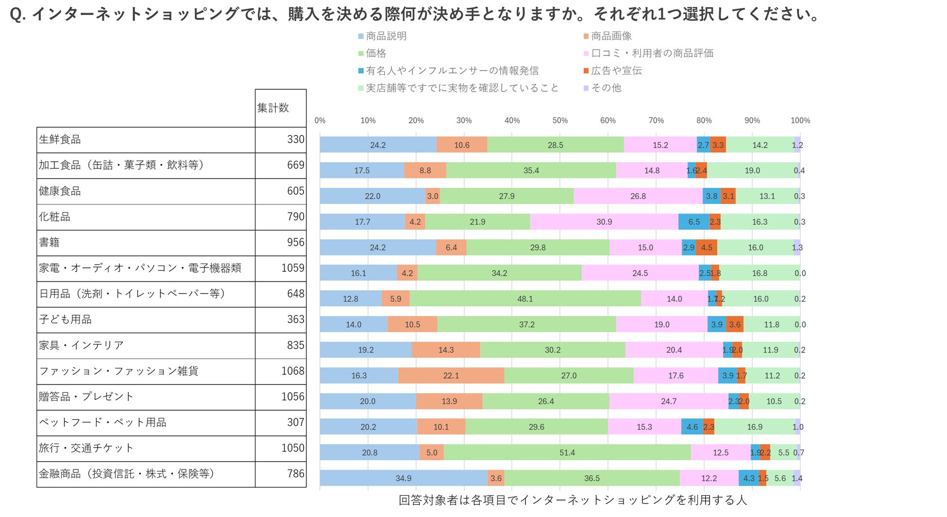 続いてインターネットショッピングでの購入の決め手を商品・サービス別に尋ねたところ、「価格」はどの商品・サービスでも2割以上となりました。